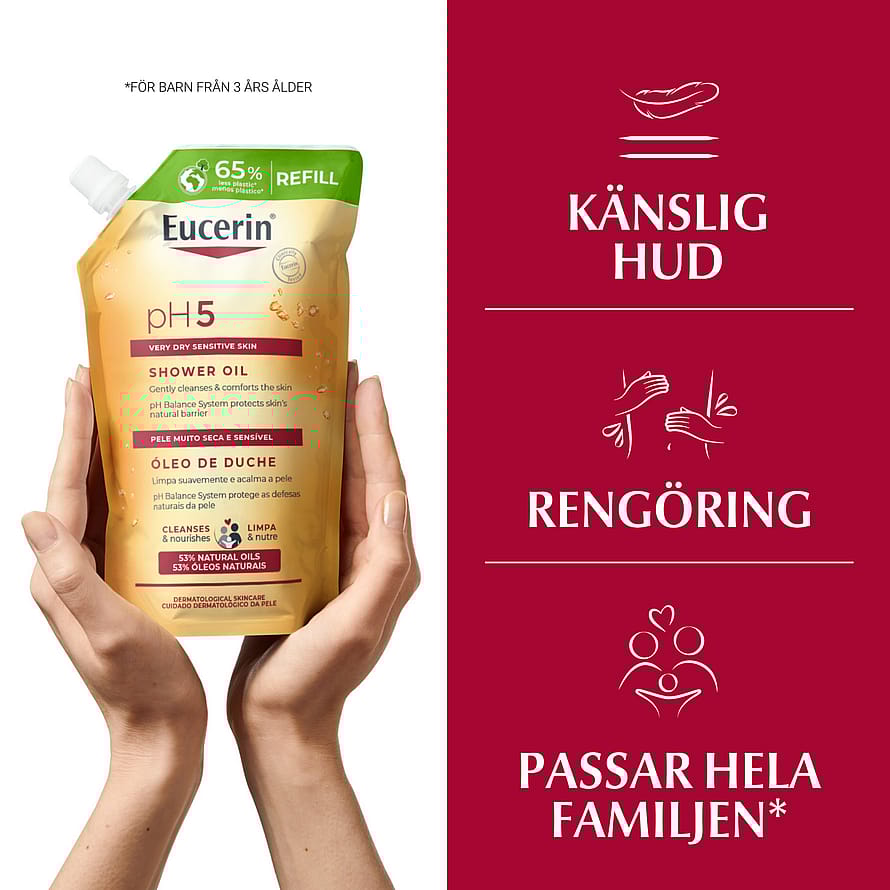 Eucerin pH5 Shower Oil Refill är en milt parfymerad duscholja i miljövänlig refillförpackning.