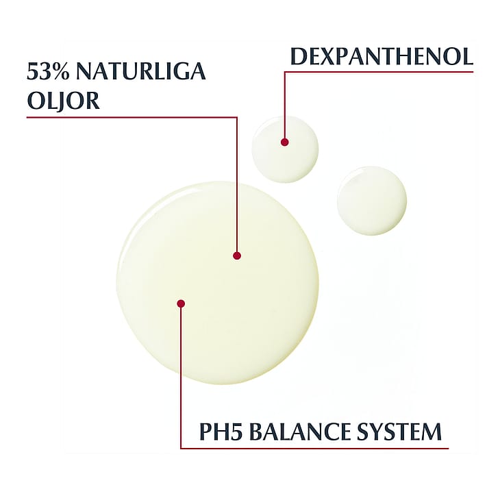 Duscholjan innehåller 53% naturliga oljor och Dexpanthenol som skonsamt rengör och respekterar hudens egna mikrobiom. Formulan med pH Balance System hjälper till att vårda hudens optimala pH-värde och naturliga skyddsbarriär. Resultaten är en hud som skonsamt rengörs. Huden känns len och mjuk, skyddas från att torka ut och återfår sitt lugn. Lämplig även på problematisk, känslig, intolerant och reaktiv hud.