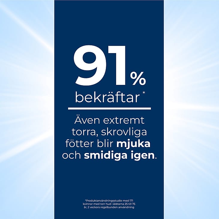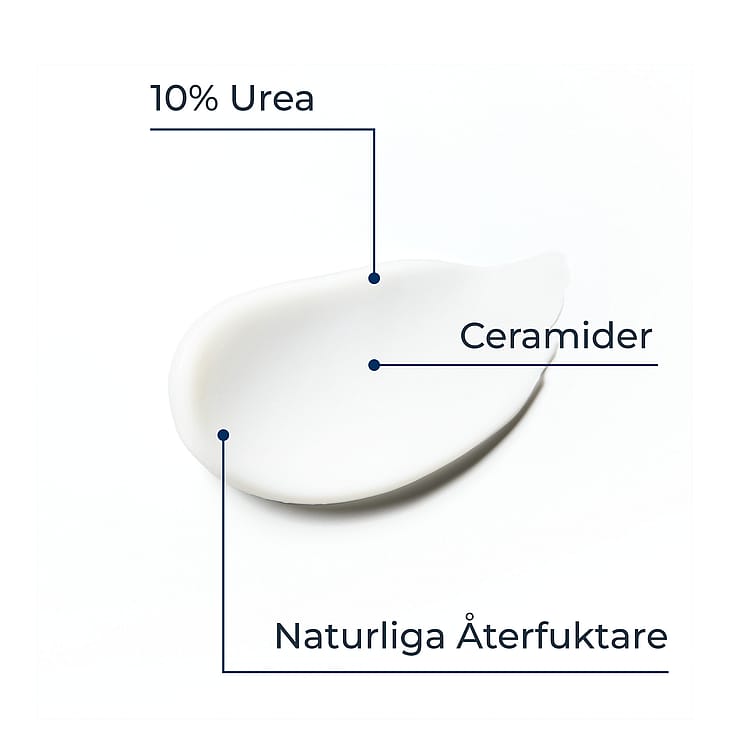 Den effektiva trippelverkande formulan innehåller 10% Urea (Karbamid), Ceramider och naturligt återfuktande ämnen som omedelbart lugnar torra fötter. Fotkrämen mjukgör grovhet, torrsprickor och stramhet. Vid regelbunden användning hjälper själva krämen mot spruckna hälar och förbättrar hudens tillstånd, samtidigt som den skyddar mot uttorkning i upp till 48 timmar. Krämen är även lämplig för fotvård om du har diabetes. Den parfymfria formulan återfuktar, skyddar fötterna mot uttorkning och lättar tryckmärken. Resultatet är intensivt återfuktade fötter och en stärkt skyddsbarriär.