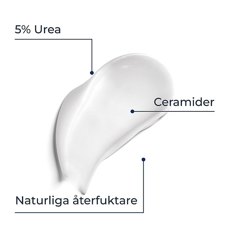 Den unika formulan med trippelverkande sammansättning ger en omedelbar lugnande effekt på tecken för sträv, mycket torr hud: grovhet, rodnad, flagnande, kliande och stramande känsla. Krämen innehåller 10% Urea (karbamid) som ger intensiv återfuktning och gör huden slätare. Naturligt återfuktande ämnen förbättrar hudens förmåga att binda vatten för ökat fuktinnehåll. Lipider, såsom Ceramider, stärker hudens skyddsbarriär och låser in fukt. Huden känns behagligt slät och smidig efter användning, samtidigt som den exfolieras skonsamt. Denna vatten-i-olja emulsion absorberas snabbt utan att lämna en kladdig hinna på huden, och resultatet är en hud som blir mer motståndskraftig och där torr hud återkommer mer sällan.