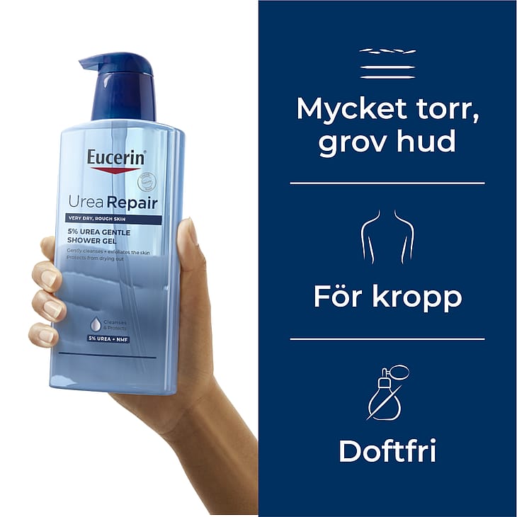 Eucerin UreaRepair 5% Gentle Shower Gel är en tvål- och parfymfri ansikts- och kroppsrengöring som är speciellt framtagen för daglig användning på mycket torr, grov och irriterad hud. Med en unik kombination av fuktgivande ingredienser – Urea och andra naturliga fuktgivare – rengör och exfolierar den varsamt grov hud utan att störa hudbarriären. Resultatet är en skonsam men effektiv rengöring. Huden upplevs mjukare, mer återfuktad och känns återställd. Efterlämnar ingen stramande känsla och är lika mild som vatten. Finns i refillförpackning för att reducera plastavfall och bidra till en mer hållbar produktlivscykel.