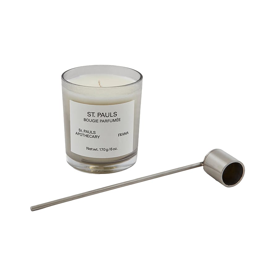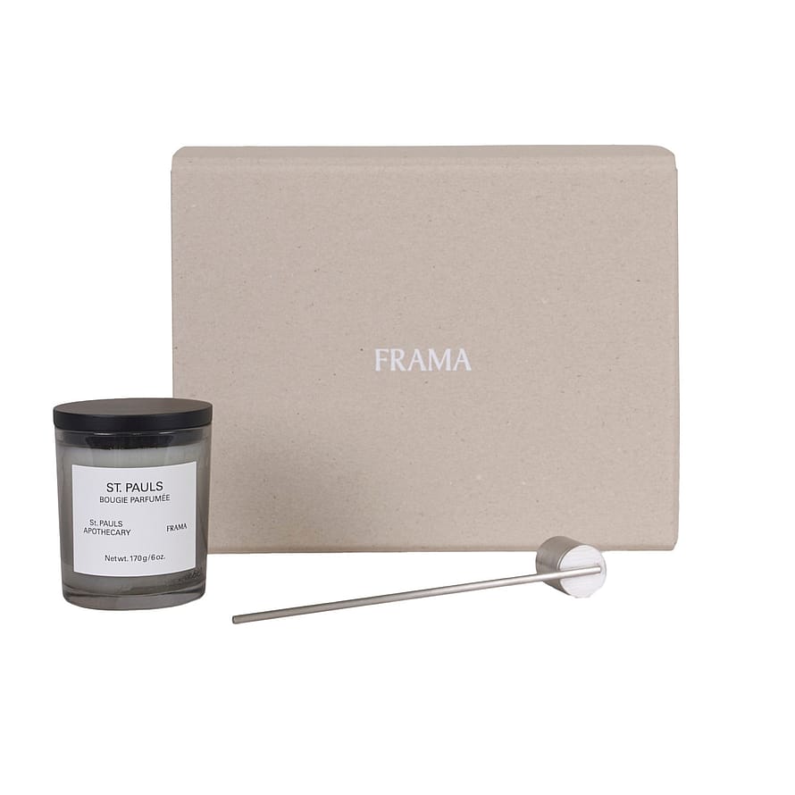 En duo som skapar stämning i alla utrymmen. St. Pauls Scented Candle, med sin jordiga och djupa doft, behåller en distinkt fräschör och kopplar samman det förflutna och nuet inom FRAMAs universum. Candle Snuffer, en modern tolkning av den klassiska snuffern, är tillverkad av både ömtåligt och hållbart rostfritt stål. Med tiden utvecklas snuffern och får en vacker patina.