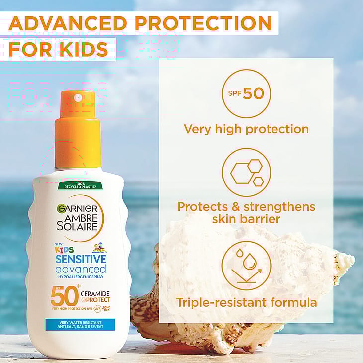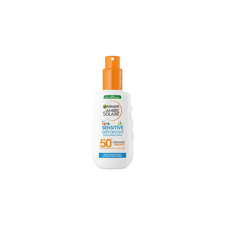Garnier Ambre Solaire Sensitive Advanced Kids Sun Trigger spray SPF 50+ är en hypoallergen solkräm för barn som är särskilt utvecklad för känslig hud. Skyddar mot UVB- och UVA-strålar. Hypoallergen formula utan parfym som är utvecklad för känslig hud. Formula i en lätt lotion som är vattenresistent.