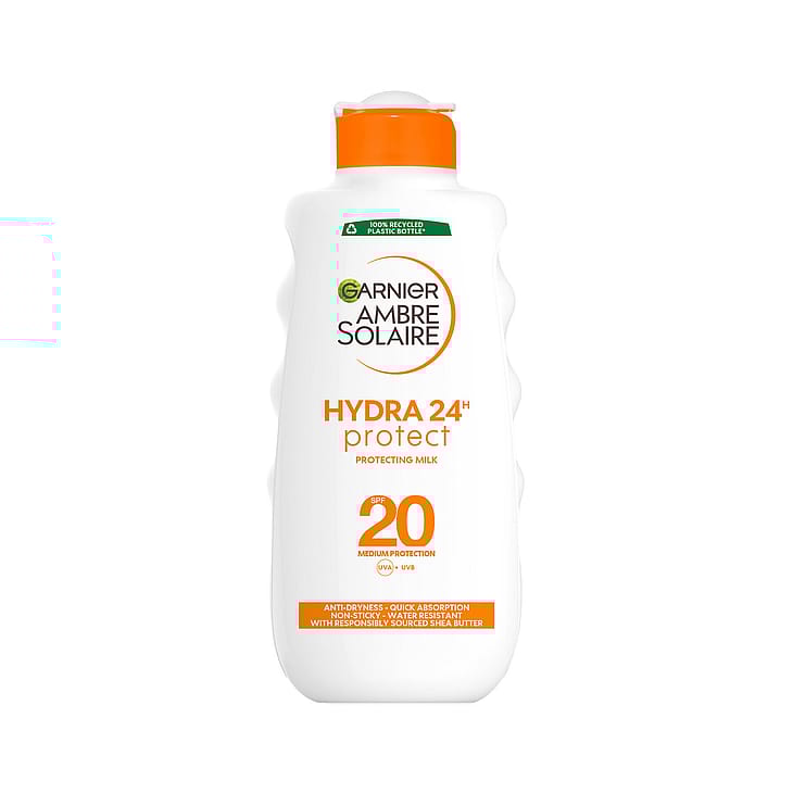 Garnier Ambre Solaire Hydra24 Protection Milk SPF20 skyddar mot UVA- och UVB-strålar. Fuktgivande formula som hjälper till att motverka solens uttorkande effekt. Fuktgivande i 24 timmar*. Filtersystemet hjälper till med att skydda huden mot: UVA: Tidiga tecken på åldrande samt långvariga skador på huden som orsakas av solens strålar. UVB: Omedelbara skador på huden som orsakas av solens strålar. *Instrumentellt test