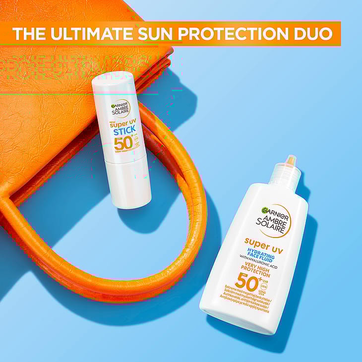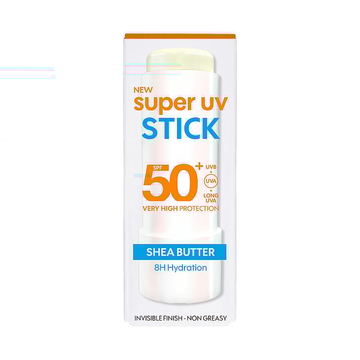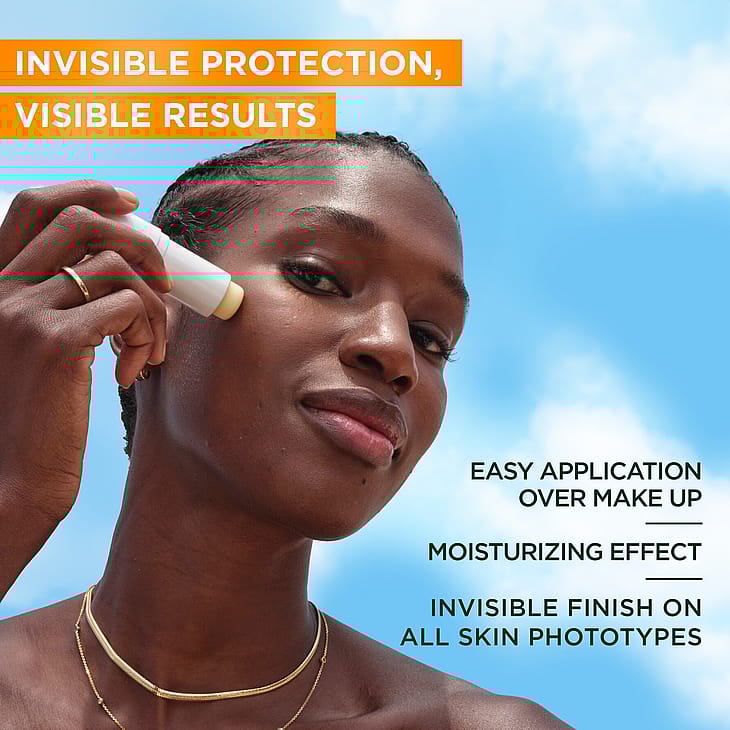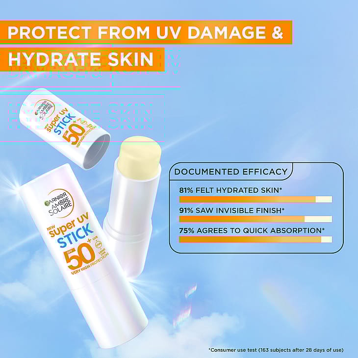 Garnier Ambre Solaire Super UV Invisible Stick är solskydd i ett praktiskt stiftformat med mycket högt solskydd SPF50+. Formulan skyddar mot UVA- och UVB-strålar från första applicering. Ger upp till 8 timmars fukt. Berikad med sheasmör och E-vitamin som är känt för sina fuktgivande och antioxidanta egenskaper.