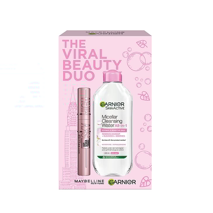 Garnier The Viral Beauty Duo Gift Box innehåller kultfavoriten Maybelline Lash Sensational Sky High Mascara Black + Garnier Micellar Cleansing Water for Sensitive Skin 400 ml. Den unika mascaraformulan lyfter fransarna oändligt högt - när det är dags att komma ner så använd micellärvattnet för att skonsamt rengöra och ta bort smink samt ge en ren och fräsch känsla på huden.