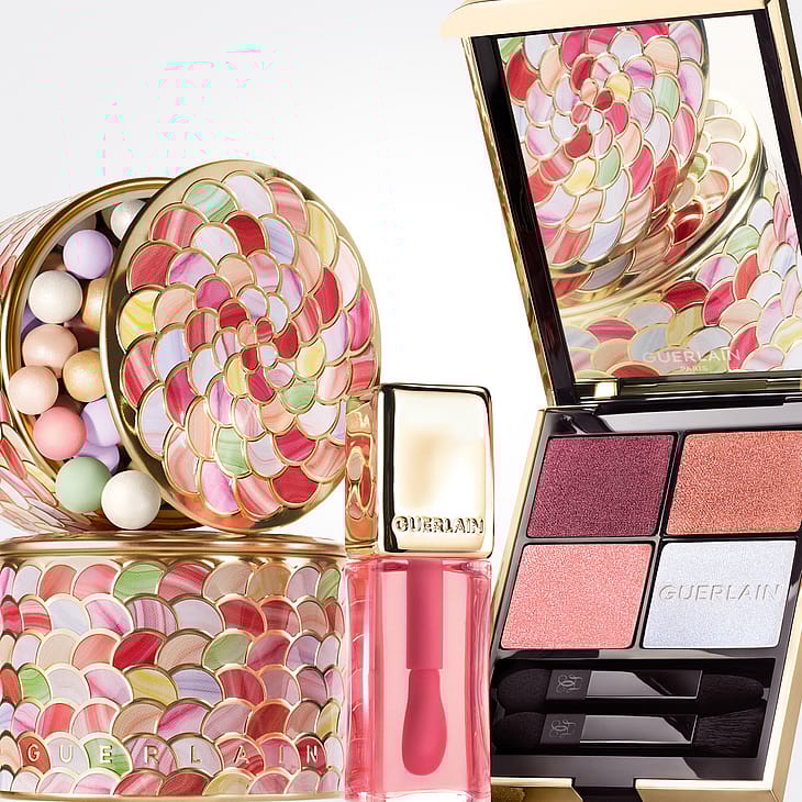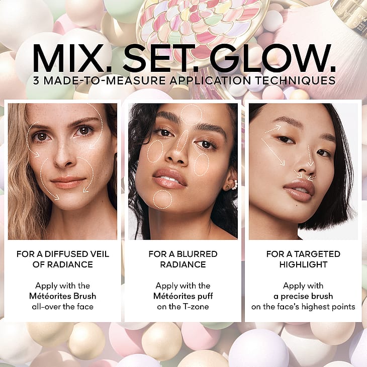 Använd Météorites-borsten¹ för att blanda puderpärlorna och applicera över hela ansiktet för ett mjukt glow. Dutta på glansiga partier med en powder puff (puderpuff) för att få lyster och en blurring-effekt.
