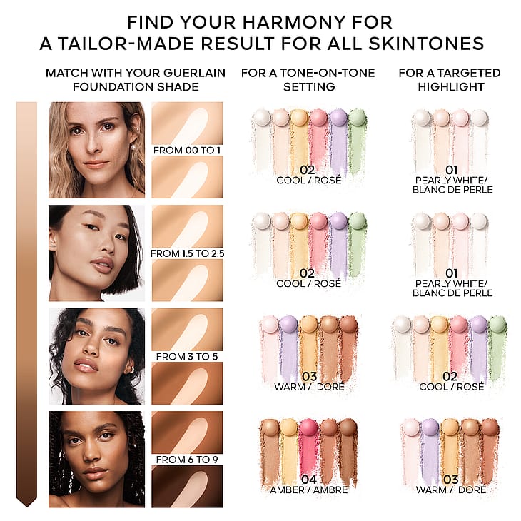 För en hudton med en riktad glöd har jag exakt valt de olika färgerna på Météorites Pearls, med fokus på undertoner och små variationer av nyanser som kännetecknar varje hudton.