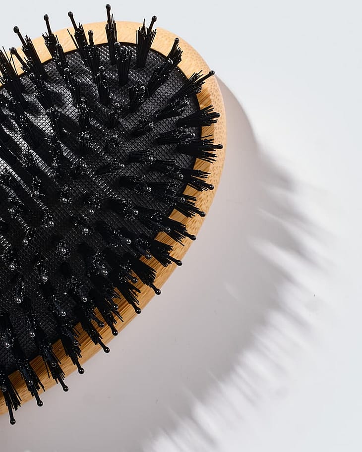 För att rengöra borsten börjar du med att ta bort håret från piggarna och slänga dem. Tvätta denna bambuborste med vatten och låt den lufttorka med piggarna liggande nedåt.