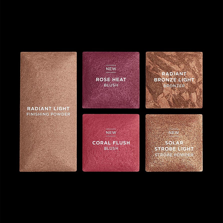 Coral Flush mica, synthetic fluorphlogopite, boron nitride, hdi/trimethylolhexyllactone crosspolymer, polymethyl methacrylate, octyldodecanol, polymethylsilsesquioxane, dimethicone, sorbic acid, trimethylsiloxysilicate, magnesium aluminum silicate, phenoxyethanol, sodium dehydroacetate, polyacrylamide, c13-14isoparaffin, benzoic acid, dehydroacetic acid, silica, potassium sorbate, laureth-7, ethylhexylglycerin, diamond powder, sorbitan sesquioleate, tin oxide, bismuth oxychloride (ci 77163), red 7 lake (ci 15850), titanium dioxide (ci 77891), yellow 5 lake (ci 19140), red 40 lake (ci 16035), iron oxides (ci 77491), ultramarines (ci 77007). Rose Heatmica, synthetic fluorphlogopite, alumina, boron nitride, hdi/trimethylol hexyllactone crosspolymer, polymethyl methacrylate, octyldodecanol, polymethylsilsesquioxane, dimethicone, sorbic acid, trimethylsiloxysilicate, sodium dehydroacetate, magnesium aluminum silicate, phenoxyethanol, silica, polyacrylamide, c13-14 isoparaffin, benzoic acid, dehydroacetic acid, potassium sorbate, laureth-7, ethylhexylglycerin, diamond powder, sorbitan sesquioleate, bismuth oxychloride (ci 77163), red 7 lake (ci 15850), red 28 lake (ci 45410), titanium dioxide (ci 77891), iron oxides (ci 77491, ci 77492, ci 77499), ultramarines (ci 77007). Solar Strobe Lightmica, synthetic fluorphlogopite, octyldodecyl stearoyl stearate, zea mays starch, boron nitride, isostearyl neopentanoate, magnesium aluminum silicate, silica, diisostearyl malate, dimethicone, lauroyl lysine, ethylhexylglycerin, 1, 2-hexanediol, caprylyl glycol, tin oxide, tocopherol, titanium dioxide (ci 77891), iron oxides (ci 77491). Radiant Bronze Lightmica, synthetic fluorphlogopite, boron nitride, hdi/trimethylol hexyllactone crosspolymer, polymethyl methacrylate, octyldodecanol, benzoic acid, c13-14 isoparaffin, dehydroacetic acid, diamond powder, dimethicone, ethylhexylglycerin, laureth-7, magnesium aluminum silicate, phenoxyethanol, polyacrylamide, polymethylsilsesquioxane, potassium sorbate, silica, sodium dehydroacetate, sorbic acid, sorbitan sesquioleate, tin oxide, trimethylsiloxysilicate, bismuth oxychloride (ci 77163), iron oxides (ci 77491, ci 77492, ci 77499), titanium dioxide (ci 77891). Radiant Lightmica, synthetic fluorphlogopite, boron nitride, hdi/trimethylol hexyllactone crosspolymer, polymethyl methacrylate, octyldodecanol, silica, benzoic acid, c13-14 isoparaffin, dehydroacetic acid, diamond powder, dimethicone, ethylhexylglycerin, laureth-7, magnesium aluminum silicate, phenoxyethanol, polyacrylamide, polymethylsilsesquioxane, potassium sorbate, sodium dehydroacetate, sorbic acid, sorbitan sesquioleate, trimethylsiloxysilicate, bismuth oxychloride (ci 77163), iron oxides (ci 77491, ci 77492, ci 77499), titanium dioxide (ci 77891).