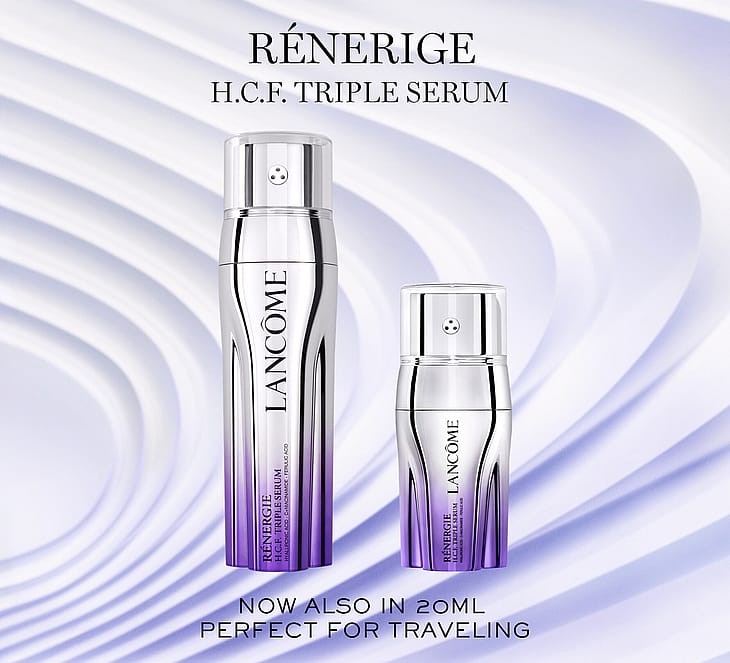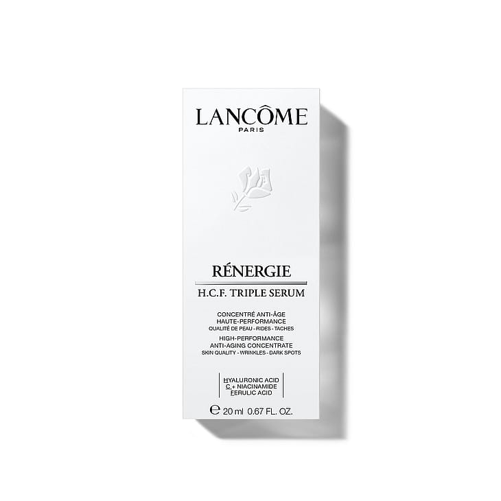 Upplev den nya eran av Lancômes effektiva antiageing-hudvård. Rénergie H.C.F. Triple Serum, patenterat till 2035, innehåller hyaluronsyra, C-vitamin + niacinamid och ferulinsyra i en vårdande trippel dos. Dessa tre aktiva ingredienser som används av dermatologer har nu för första gången förenats i en trippeldos i ett ytterst effektivt antiageing-serum för att stärka överhuden lager för lager. FÖRSTA LAGRET: Ökad fasthet och förbättrad hudkvalitet