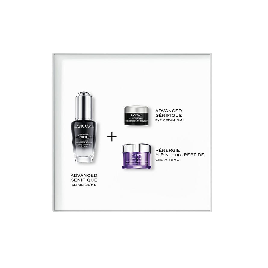 Lancôme Advanced Génifique hudvårdsset passar dig som vill förbättra din hudkvalitet. Advanced Génifique serum är det första steget till vacker hud. Serumet optimerar hudvårdsrutinen och stärker hudens ungdomliga utseende. Advanced Génifique är ett stärkande och fuktgivande serum som boostar hudens lyster. Patenterad formula med pre- och probiotikaextrakt som balanserar hudens mikrobiom: Ett starkt mikrobiom är nyckeln till en stark hudbarriär för en fin och ungdomlig hudkvalitet. Setet är ett startset för att kicka igång din hudvårdsrutin och innehåller: Génifique Serum 20ml, Génifique Ögoncreme, Rénergie Multi-Lift Ultra 15ml.