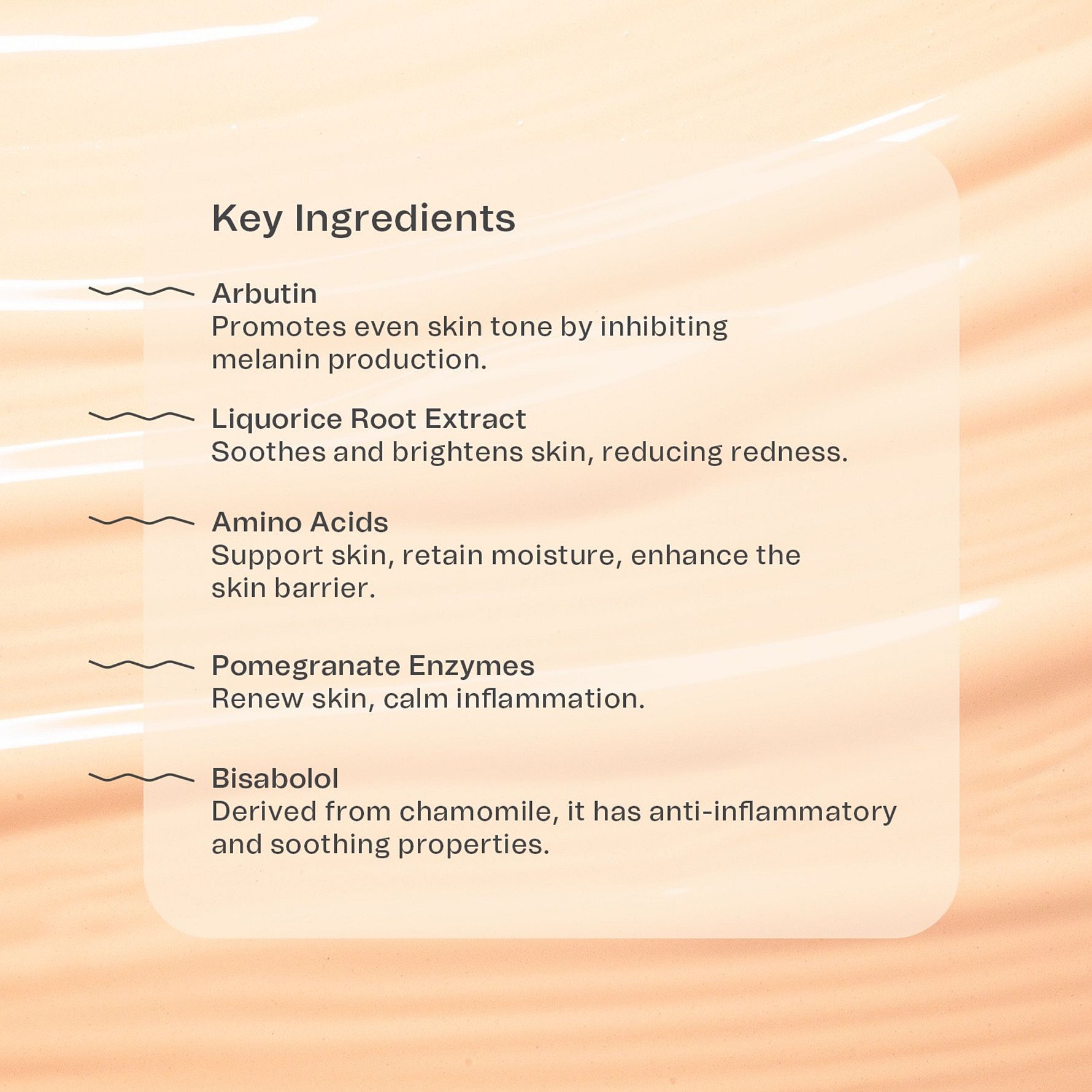 Aqua, Octyldodecyl Myristate, Glycerin, Dimethicone, Canola Oil, Jojoba Esters, Cetyl Alcohol, Glyceryl Stearate, Hydroxyethyl Acrylate/Sodium Acryloyldimethyl Taurate Copolymer, Squalane, Tocopheryl Acetate, Synthetic Fluorphlogopite, Ceteth-20, Allantoin, Lactobacillus/Punica Granatum Fruit Ferment Extract, Ascorbyl Palmitate, Glutamic Acid, Sodium PCA, Bisabolol, Titanium Dioxide, Betaine, Biosaccharide Gum-4, Polysorbate 60, Silica, Sodium Hyaluronate, PCA, Glycine Soja Oil, Beta-Sitosterol, Sorbitan Isostearate, Leuconostoc/Radish Root Ferment Filtrate, Steareth-20, Sodium Lactate, PEG-75 Stearate, Tocopherol, Serine, Alanine, MICA, Glycine, Squalene, Lysine HCl, Threonine, Arginine, Proline, Butylene Glycol, Glycyrrhiza Uralensis Root Extract, Lecithin, Arbutin, Linoleic Acid, Sodium Hydroxide, Ethylhexylglycerin, Sodium Benzoate, Linolenic Acid, Glutathione, Alcohol, Potassium Sorbate, Phenoxyethanol, CI 77491, CI 77891