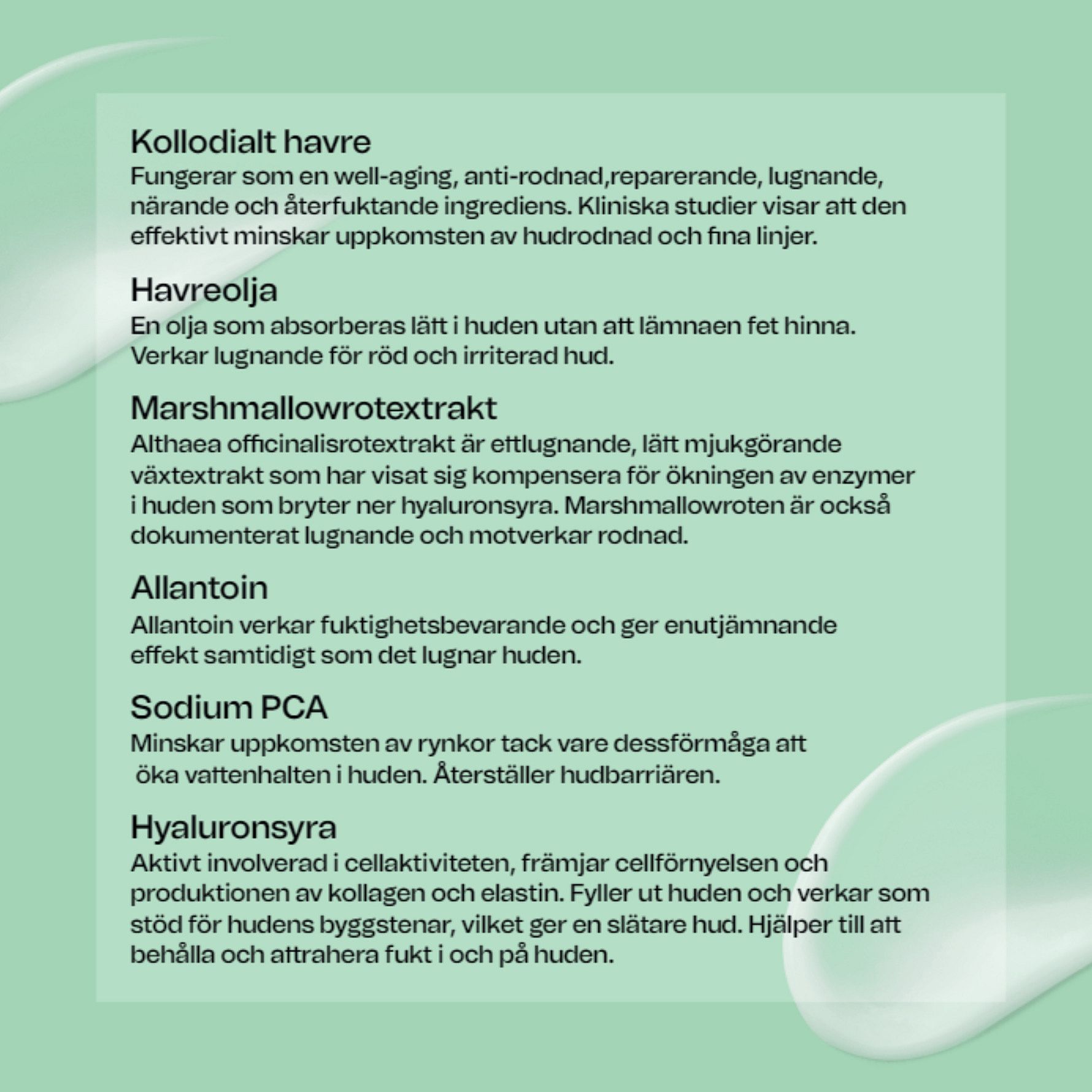 En mjölkig rengöringskräm med en unik sammansättning av två olika typer av havre, marshmallowrotextrakt och fuktbevarande glycerin, sodium PCA och hyaluronsyra. Formulan lugnar och ger näring åt huden samtidigt som den skonsamt tar bort smink och orenheter och håller hudens barriär intakt. Resultatet är mjuka kinder utan att göra huden torr och stram. Idealisk för känslig, torr och blandad hud.