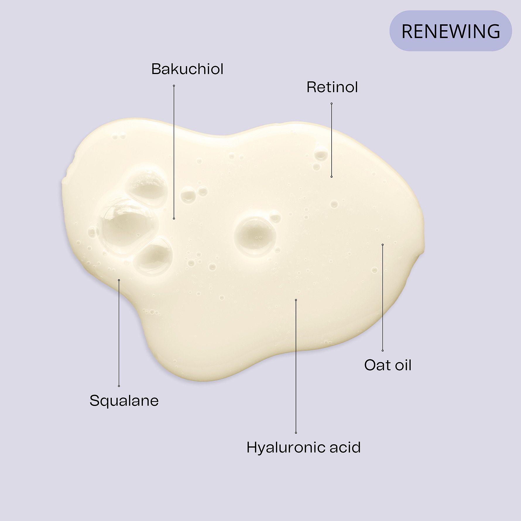 Aqua, Glycerin, Propanediol, Steareth-2, C15-19 Alkane, Squalane, Avena Sativa Kernel Oil, Steareth-20, Retinol, Sodium Hyaluronate, Bakuchiol, Biosaccharide Gum-1, Triticum Vulgare Seed Extract, Tocopheryl Acetate, Tocopherol, Lecithin, Xanthan Gum, Glycine Soja Oil, Beta-Sitosterol, Squalene, Ethylhexylglycerin, Sodium Acrylates Copolymer, Phenoxyethanol, Citric Acid.
