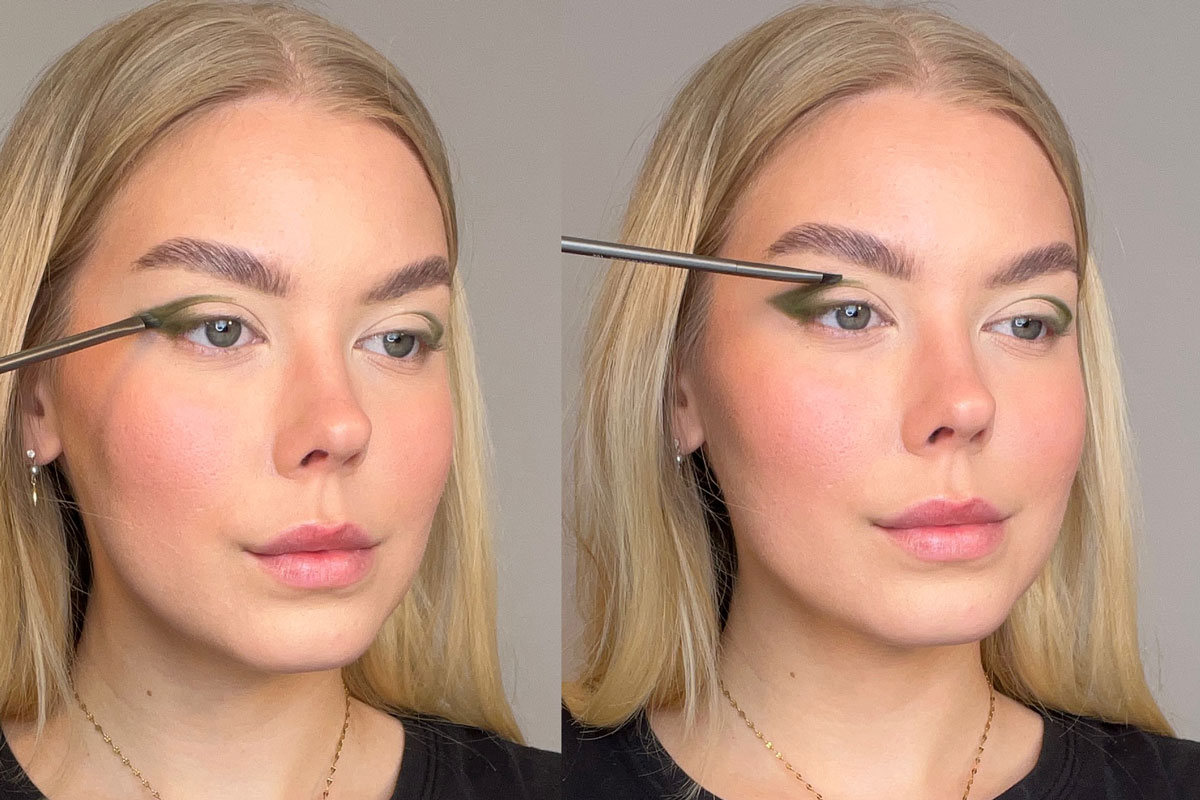 Börja med att lägga den mörkt gröna skuggan och applicera den i yttre ögonvrån och ut mot tinningarna i en spetsig form. Ta gärna hjälp av en spetsig sminkpensel, så blir det enklare att få till formen. Lägg också skugga i globlinjen men lämna ögonlocken fria från färg. Skugga och tona noga ut ögonskuggan för att ge ögonen ett lite mjukare intryck, utan skarpa kanter. Applicera sedan den ljusa och mest knalliga gröna ögonskuggan. Skugga på halva, yttre ögonlocket och tona försiktigt in den ljusare skuggan i din mörkare skugga. Låt nedre ögonfransraden vara helt fri från ögonskugga.