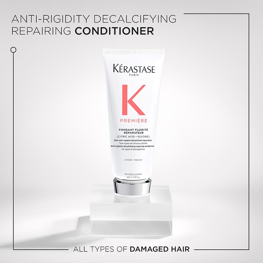 Fondant Fluidité Réparateur från Kérastase är ett reparerande, kalkavlägsnande och mjukgörande balsam för skadat hår. Det avlägsnar det kalköverskott som samlas i behandlat hår och reparerar sedan skadorna i en dubbelverkande effekt som återställer mjukhet, fukt och styrka.