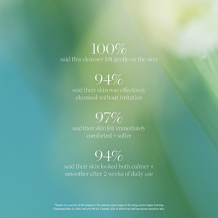 *Baserat på en undersökning av 36 personer (*32 sminkanvändare) i åldrarna 21-63 år som använde Active Algae Calming Cleansing Balm 2 gånger dagligen morgon och kväll i 2 veckor, varav 52% hade en självupplevd känslig hud.