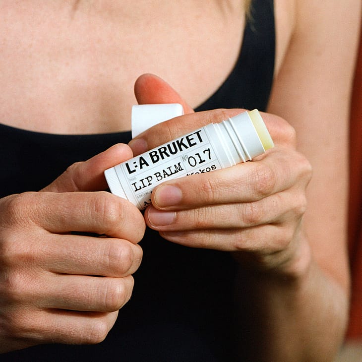 De högkoncentrerade läppbalsamen från La Bruket har 100 procent naturliga, potenta COSMOS-certifierade ingredienser, i en helt återvinningsbar förpackning. Det generöst tilltagna läppbalsamen är tillverkade av vegetabiliska oljor som sötmandel- och kokosnötsolja och vitamin E, för att garantera långvarig fukt och komfort.