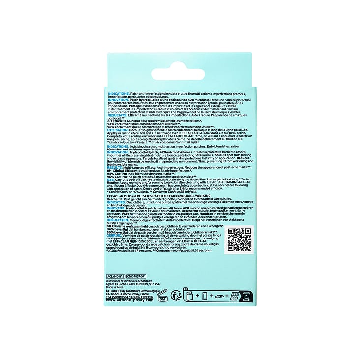EFFACLAR DUO+M MULTI-ACTION IMPERFECTION PATCH består av 22 osynliga och ultratunna finnplåster, som effektivt och snabbt bekämpar orenheter. Orenheter reduceras och minskas synligt.
