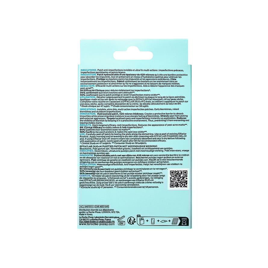 EFFACLAR DUO+M MULTI-ACTION IMPERFECTION PATCH består av 22 osynliga och ultratunna finnplåster, som effektivt och snabbt bekämpar orenheter. Orenheter reduceras och minskas synligt.