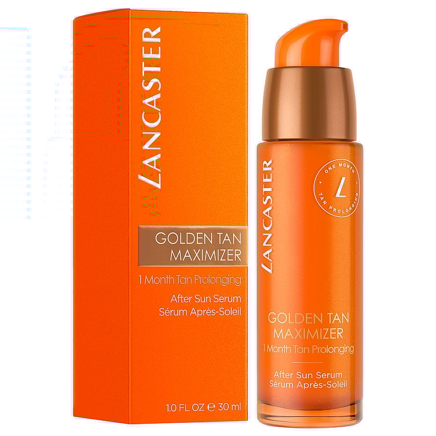 Älskar du din gyllene solbränna från Lancaster? Tänk om du kunde förlänga den för en oändlig sommarkänsla? Vårt Golden Tan Maximizer After Sun Serum förlänger din solbränna i upp till en månad och lugnar omedelbart solutsatt hud. Tillverkat med naturlig Buriti-olja intensifierar Lancasters Tan Activator Complex melaninproduktionen för en gyllene, jämn och långvarig solbränna. Den kraftfulla kombinationen av naturligt sojaextrakt och hyaluronsyreförstärkare hjälper till att förebygga och reparera solskador (rynkor och förlust av fasthet). Dess reparerande komplex lugnar omedelbart huden och ger en känsla av intensiv komfort. Det minskar risken för flagning. Efter solexponering återfuktar detta lätta serum huden på djupet och återställer dess naturliga lyster. Dess diskret skimrande textur skiftar från vitt till guld för att omedelbart framhäva din gyllene solbränna. Innehåller 94,7 % ingredienser av naturligt ursprung.