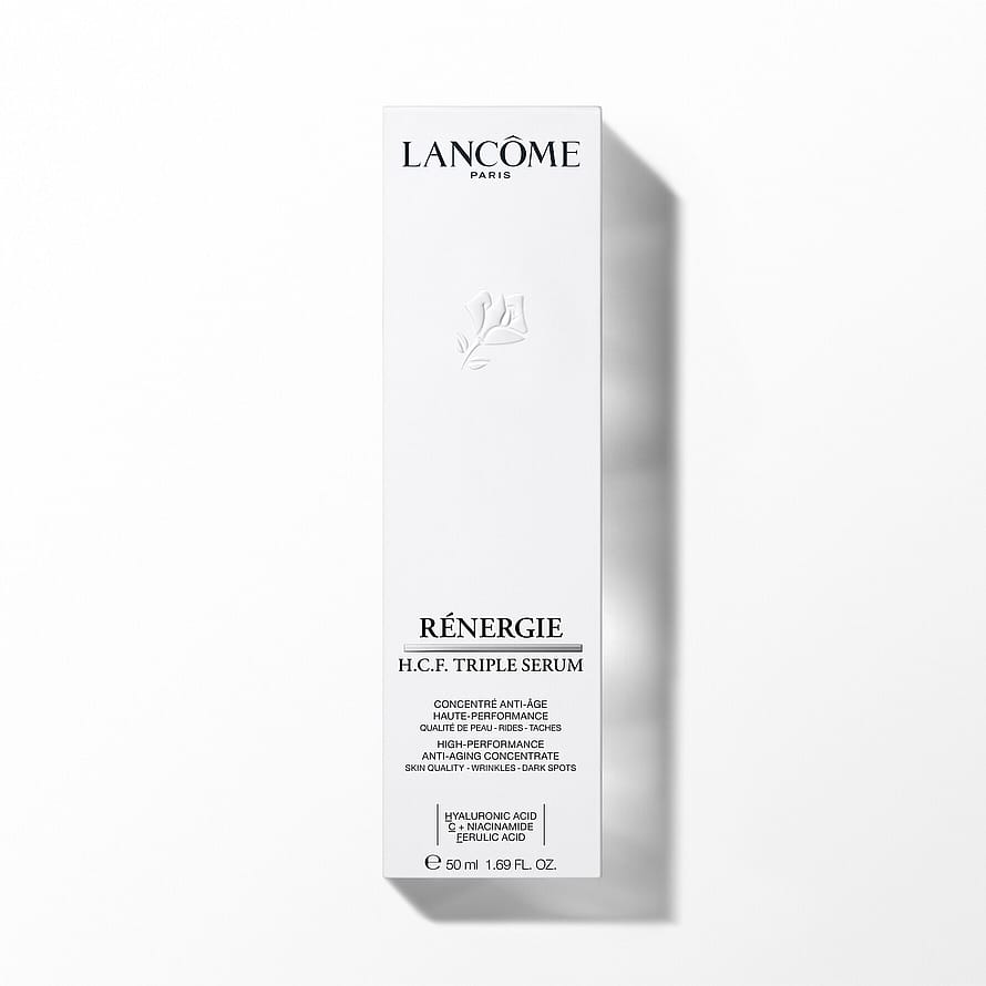 Upplev den nya eran av Lancômes effektiva antiageing-hudvård. Rénergie H.C.F. Triple Serum, patenterat till 2035, innehåller hyaluronsyra, C-vitamin + niacinamid och ferulinsyra i en vårdande trippel dos. Dessa tre aktiva ingredienser som används av dermatologer har nu för första gången förenats i en trippeldos i ett ytterst effektivt antiageing-serum för att stärka överhuden lager för lager. FÖRSTA LAGRET: Ökad fasthet och förbättrad hudkvalitet