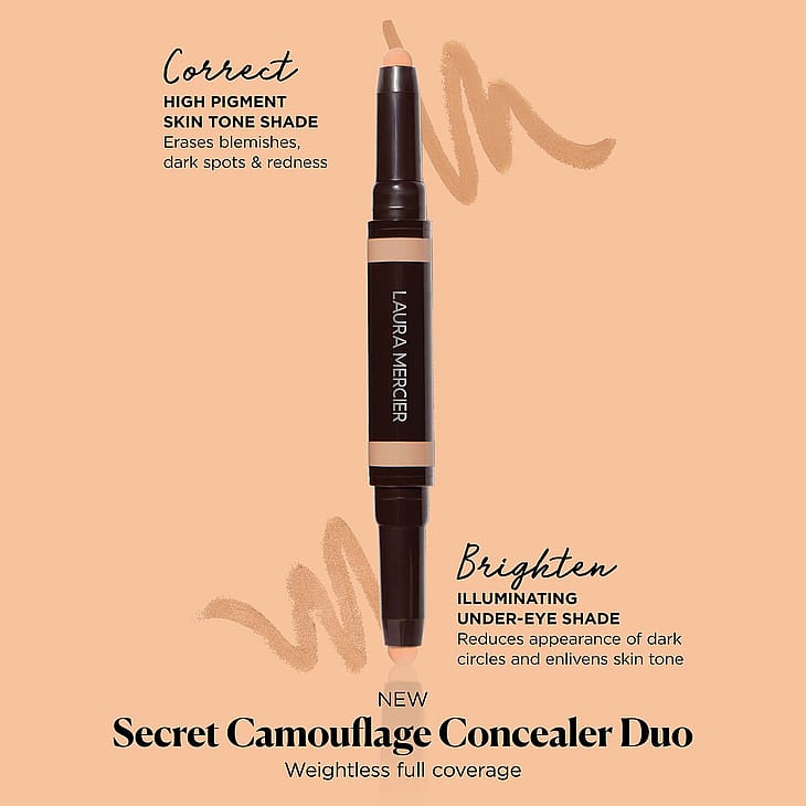 Laura Merciers ikoniska Secret Camouflage, nu i en förenklad version. En två-i-en concealerduo som enkelt och smidigt täcker ojämnheter i ansiktet och ljusar upp under ögonen. Två högpigmenterade formulas som är snälla mot huden, med Brightening Pearls för att ljusa upp det känsliga ögonområdet och Lotus Flower Extract för att lugna huden. Med sin krämiga, kamouflerande effekt är denna produkten idealist att ha med när du är on-the-go för att kunna täcka när som helst, var som helst.