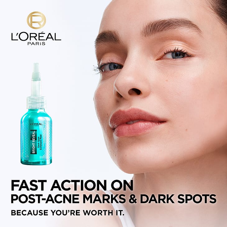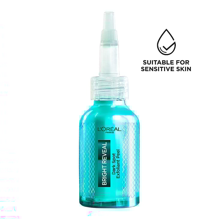 L’Oréal Paris Bright Reveal Dark Spot Exfoliant Peel är en professionellt inspirerad hudpeeling för hemmabruk. Formulan innehåller AHA, BHA, PHA & niacinamid och ger huden ett förnyat, klarare intryck. Kosmetokliniskt dokumenterad effekt: Efter 1 månad är mörka fläckar och märken efter akne synbart mindre framträdande.