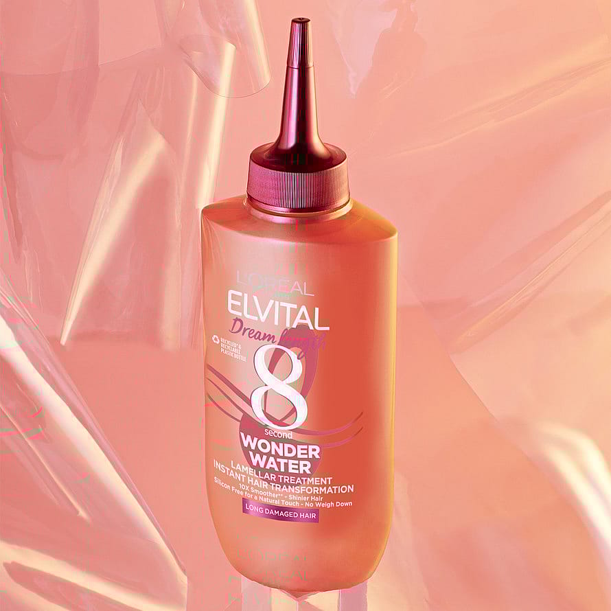 L'Oréal Paris Elvital Dream Length Wonder Water med lamellteknologi gör ditt hår blankare och 10X slätare* på bara 8 sekunder. I en snabb applicering täcker de ultratunna lamellerna omedelbart skadade områden av hårfibrerna och jämnar ut hårets ytskikt. Den lätta, flytande formulna passar alla hårtyper och är utan silikon för en naturlig känsla.