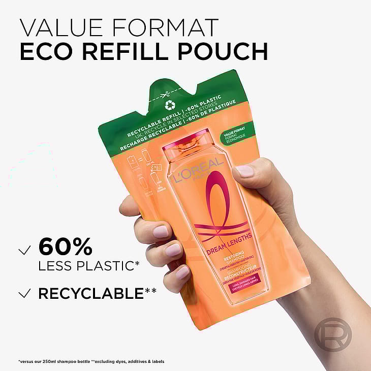 Återvinningsbar refillförpackning som innehåller 60 % mindre mängd plast än en 250 ml-flaska.