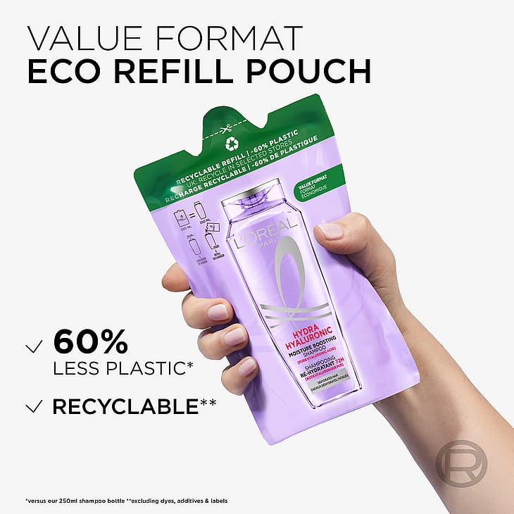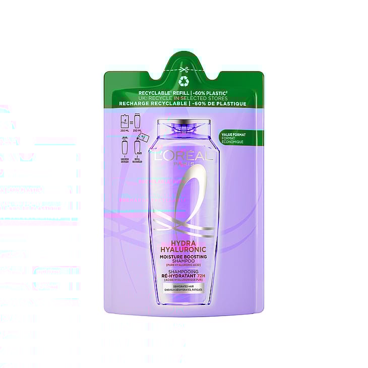 Återvinningsbar refillförpackning framställd med 60% mindre plast än en 250 ml-flaska. L'Oréal Paris Elvital Hyaluron Plump Shampoo är ett schampo för hår i behov av fukt. Formulan är berikad med hyaluronsyra och fyller på håret med fukt i 72 timmar*. Resultatet är ett fylligare hår som är 10x mer återfuktat*.