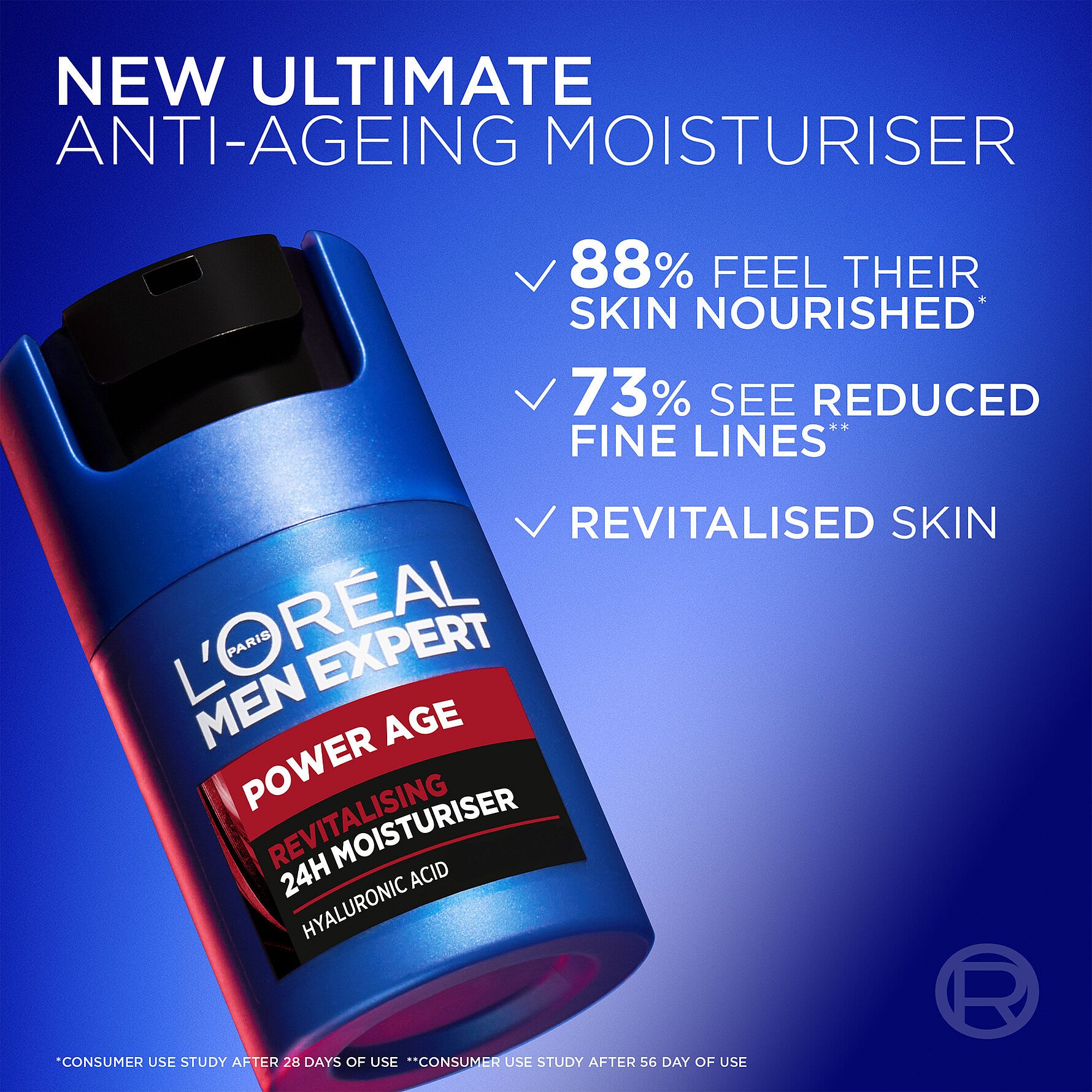Men Expert Power Age Revitalising 24H Moisturiser ansiktskräm för män med torr hud och ålderstecken. Formulan är berikad med hyaluronsyra känt för sina fuktgivande egenskaper och fungerar på 3 sätt: ger fastare hud, återfuktar intensivt och ger en fräsch känsla. Snabbabsorberande och känns inte fet på huden.