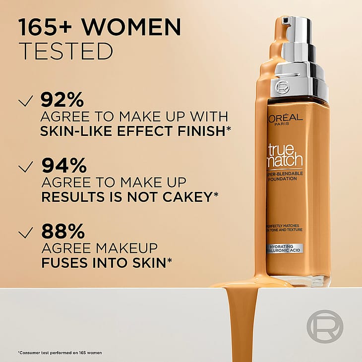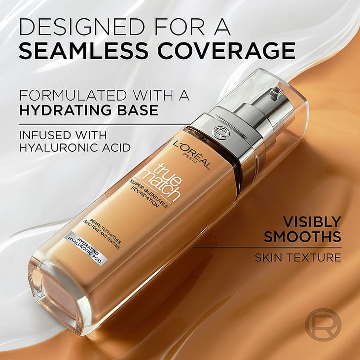 Hitta din True Match med L'Oréal Paris True Match Super-blandbara foundation. Formula som är superlätt att tona ut och anpassar sig perfekt till din hudton. Fin konsistens för ett fefritt resultat som matchar dig och ser naturlig ut. Dess lätta formula ger dessutom en jämn täckning och strålande finish som ser naturlig ut, utan ett kakigt eller puderlikt resultat. Fuktgivande makeupbas berikad med hyaluronsyra för 24 timmars fukt*.