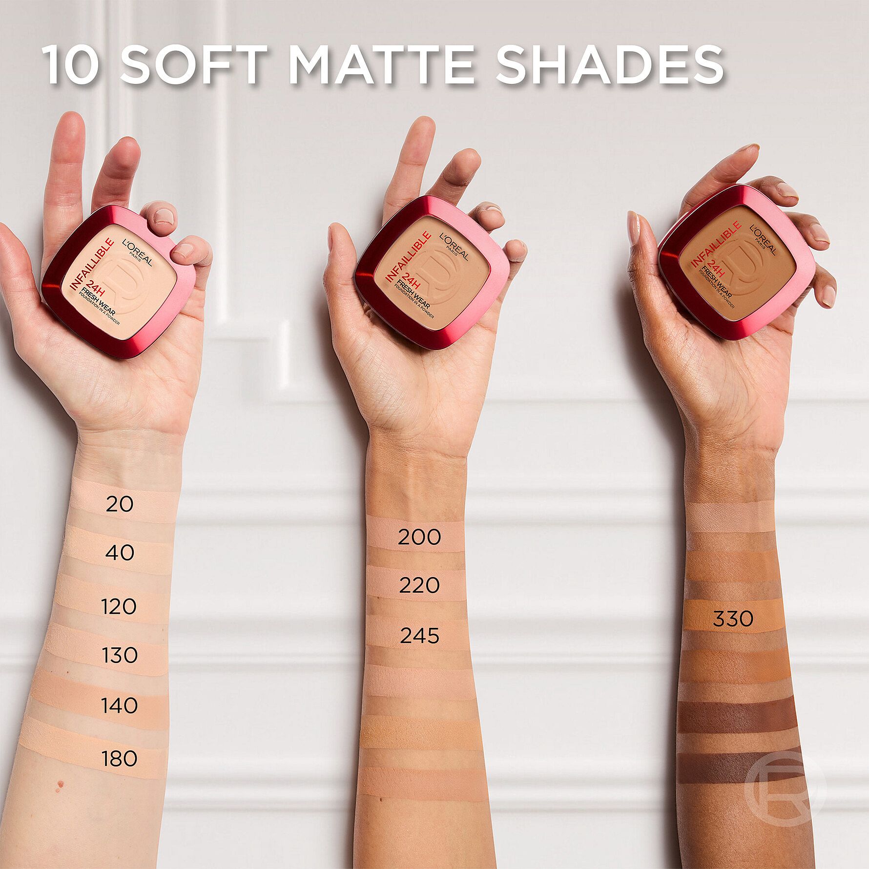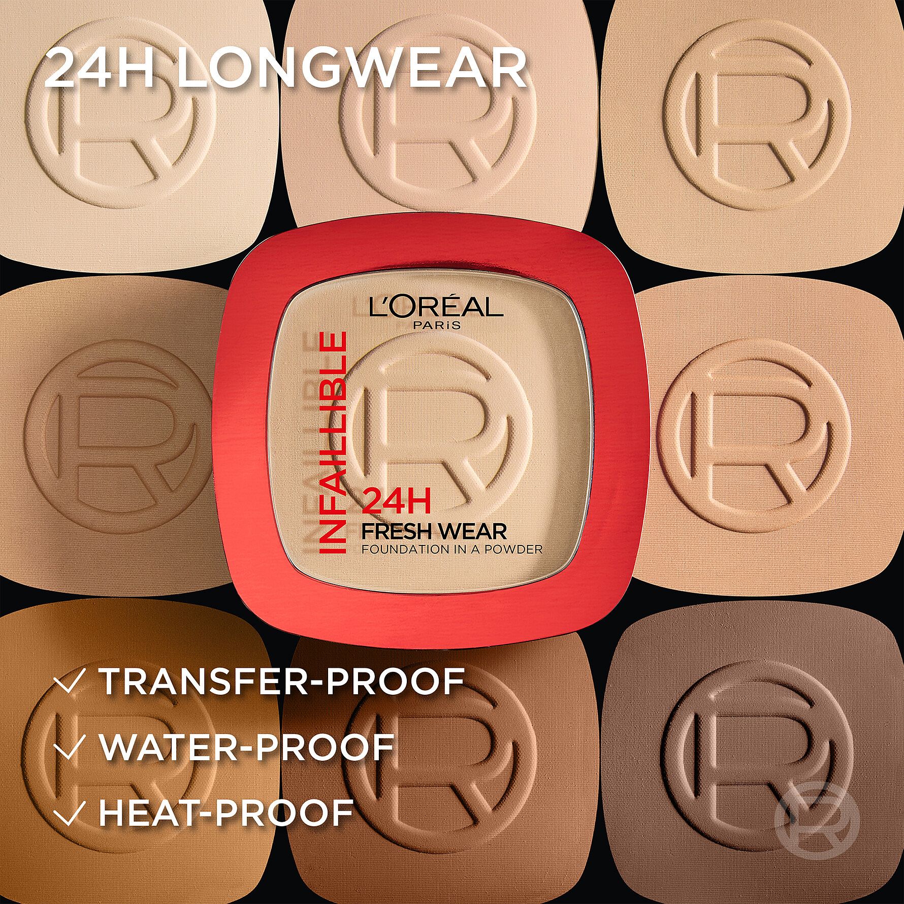 Upptäck Infallible 24H Fresh Wear Foundation In A Powder från L'Oréal Paris. Puderfoundation som täcker, samtidigt som den ger ett matt resultat utan att bli kakig. Detta är mer än bara ett puder! Produkten är berikad med fina pigment som fångas av huden för en matt och naturlig finish hela dagen. Den är lätt att tona ut och ger huden en naturlig, felfri, sammetslen och matt finish. - Tillgänglig i 16 nyanser för att matcha olika hudtoner. Smetar inte ut. Svettresistent. Vattenfast. - Värme- och fuktresistent Få ut mer av ditt puder!