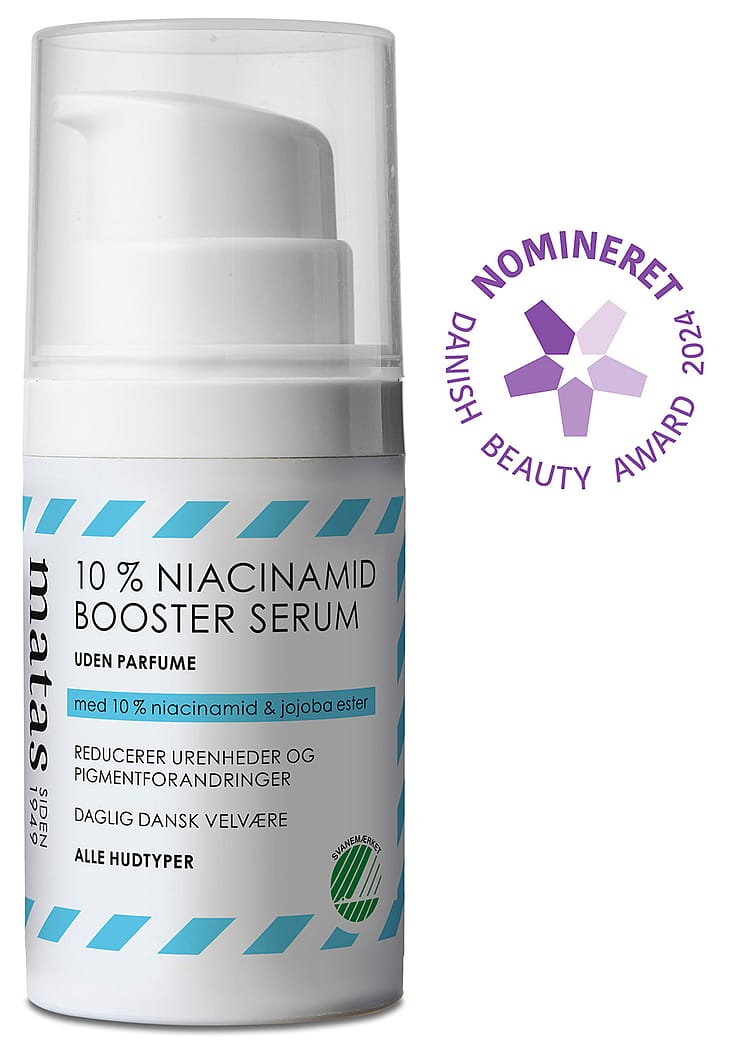 Matas 10 % Niacinamid Booster Serum utan parfym innehåller 10 % niacinamid som minskar orenheter och talg i huden samt reducerar rynkors synlighet och åldersbetingade pigmentförändringar.