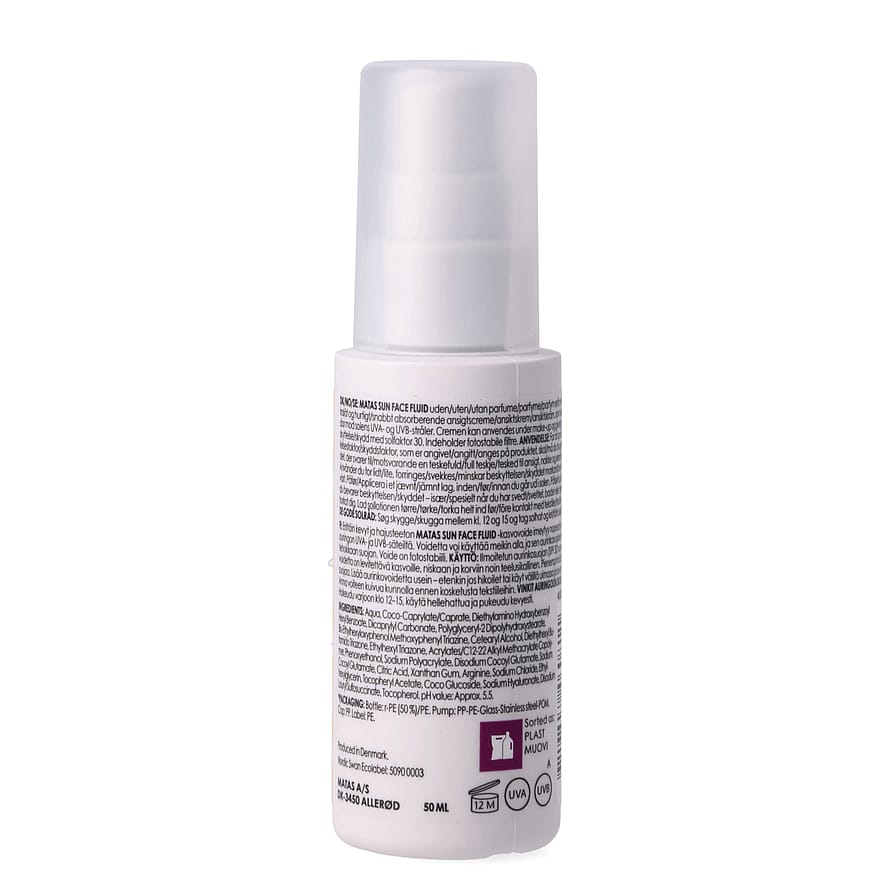 Matas Striber Sun Face Fluid utan parfym är en ultralätt och snabbabsorberande ansiktskräm med fotostabila solfilter som effektivt skyddar mot solens UVA- och UVB-strålar.