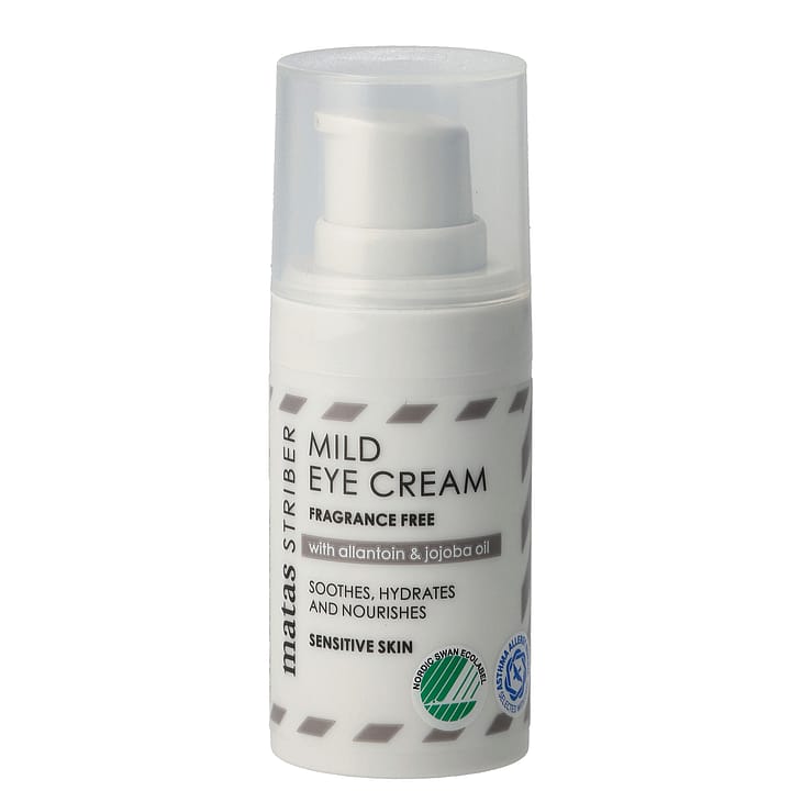 Matas Mild Ögonkräm är parfymfri och särskilt utvecklad för känslig hud runt ögonen. Den är märkt med både Blå Krans och Svanen.