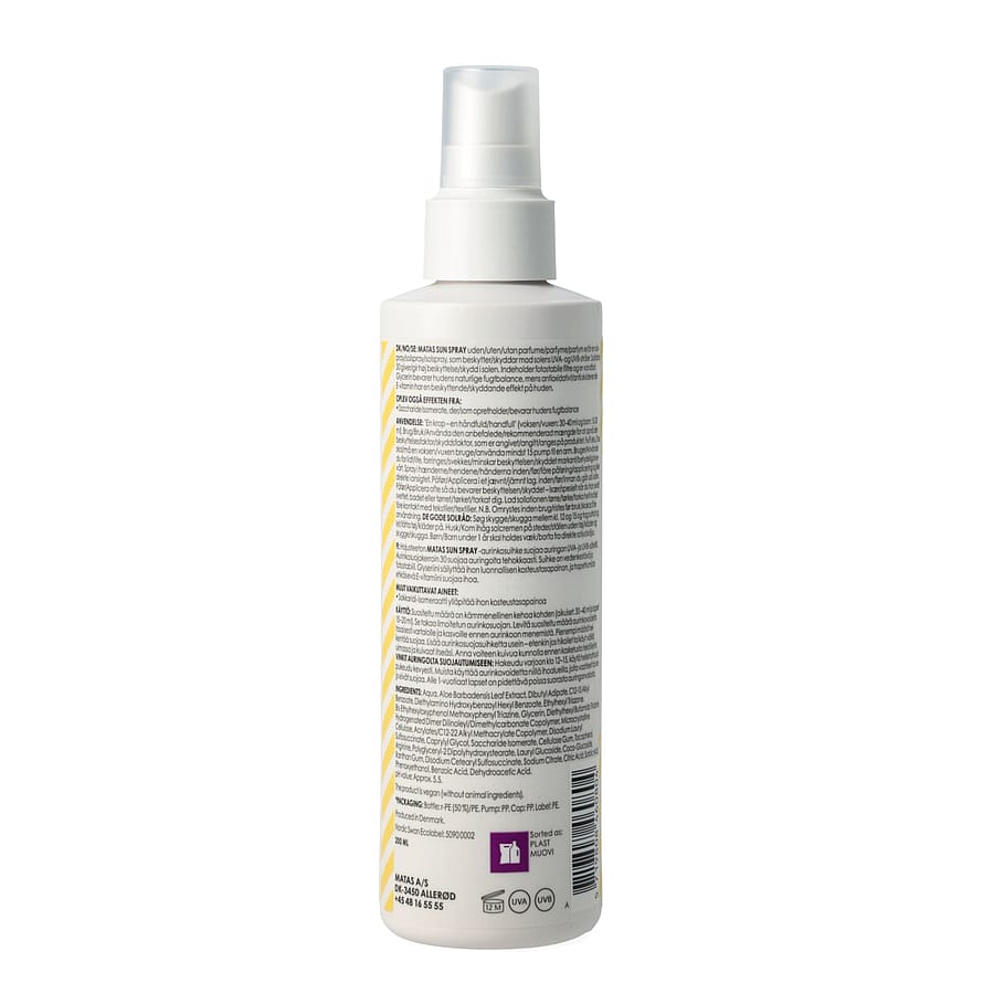 Matas Striber Sun Spray utan parfym skyddar effektivt mot solens skadliga UVA- och UVB-strålar. Solskyddsfaktor 30 ger högt skydd i solen. Innehåller fotostabila filter och är vattenfast.