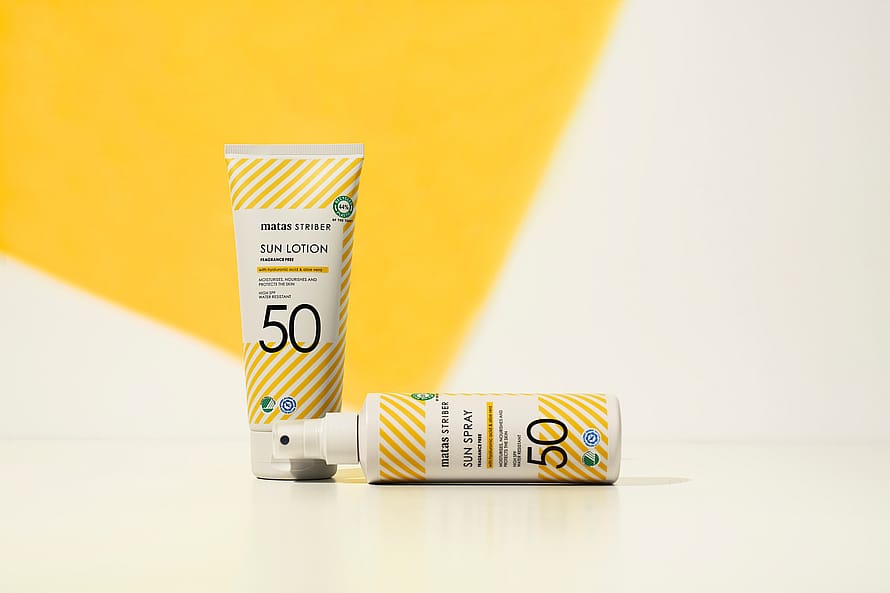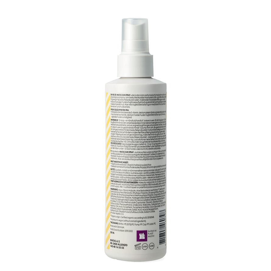 Matas Striber Sun Spray utan parfym skyddar effektivt mot solens skadliga UVA- och UVB-strålar. Solskyddsfaktor 50 ger högt skydd i solen. Innehåller fotostabila filter och är vattenfast.