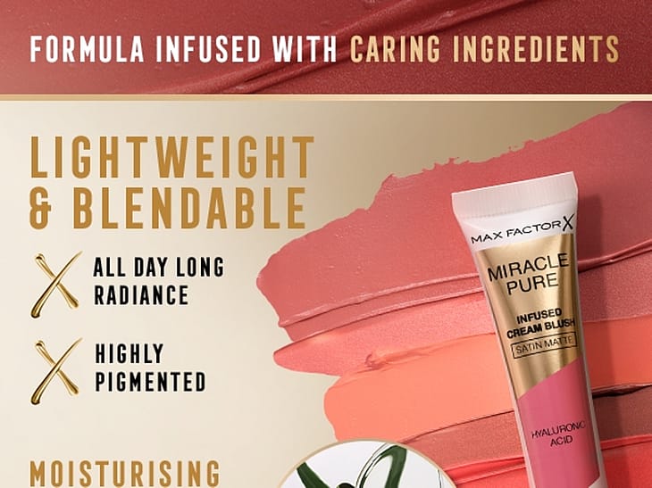 Få friska, rosiga kinder samtidigt som du vårdar din hud! Max Factors Miracle Pure Cream Blush innehåller ett fuktgivande komplex som återfuktar och ger huden fyllighet, samtidigt som den får en vacker lyster. Detta rouge är berikat med hyaluronsyra och squalane och har en lätt, krämig och silkeslen konsistens som förvandlar huden och ger den en vacker och frisk lyster som håller hela dagen. Den finns i fyra strålande nyanser som passar alla hudtoner.