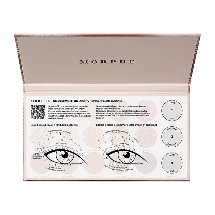 For å bli inspirert kan du stryke en nyanse fra den øverste raden nederst på øyelokket gjennom bretten, puffe en nyanse fra den nederste raden i vippekanten og trykke en nyanse fra den midterste raden på midten av øyelokket. Sammensett og tilpass ved å mikse og matche rader og trinn.