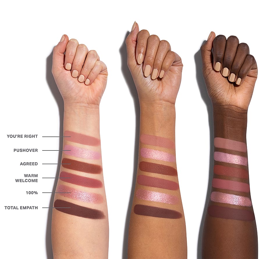 CROWD PLEASER YOU’RE RIGHT TALC, SYNTHETIC FLUORPHLOGOPITE, MICA, SILICA, MAGNESIUM STEARATE, BORON NITRIDE, DIMETHICONE, HYDROGENATED POLYISOBUTENE, OCTYLDODECL STEAROYL STEARATE, MAGNESIUM MYRISTATE, PHENOXYETHANOL, BIS-DIGLYCERYL POLYACYLADIPATE-2, TOCOPHERYL ACETATE, TRIETHOXYCAPRYLYLSILANE, CAPRYLYL GLYCOL, ETHYLHEXYLGLYCERIN, TOCOPHEROL +/- MAY CONTAIN/PEUT CONTENIR: TITANIUM DIOXIDE (CI 77891), IRON OXIDES (CI 77491, CI 77492, CI 77499). AGREED, WARM WELCOME, TOTAL EMPATH TALC, SYNTHETIC FLUORPHLOGOPITE, MICA, SILICA, MAGNESIUM STEARATE, BORON NITRIDE, DIMETHICONE, HYDROGENATED POLYISOBUTENE, OCTYLDODECL STEAROYL STEARATE, MAGNESIUM MYRISTATE, PHENOXYETHANOL, BIS-DIGLYCERYL POLYACYLADIPATE-2, TOCOPHERYL ACETATE, CAPRYLYL GLYCOL, ETHYLHEXYLGLYCERIN, TOCOPHEROL, MALTODEXTRIN, KAOLIN, TRIETHOXYCAPRYLYLSILANE, TIN OXIDE +/- MAY CONTAIN/PEUT CONTENIR: TITANIUM DIOXIDE (CI 77891), IRON OXIDES (CI 77491, CI 77492, CI 77499), ULTRAMARINES (CI 77007), CARMINE (CI 75470), BLUE 1 LAKE (CI 42090). PUSHOVER MICA, SYNTHETIC FLUORPHLOGOPITE, DIMETHICONE, PHENYL TRIMETHICONE, POLYGLYCERYL-2 TRIISOSTERATE, OCTYLDODECYL STEAROYL STEARATE, CAPRYLIC/CAPRIC TRIGLYCERIDE, LAURYL PEG-9 POLYDIMETHYLSILOXYETHYL DIMETHICONE, DIPENTAERYTHRITYL HEXAHYDROXYSTEARATE/HEXASTEARATE/HEXAROSINATE, ISOSTEARYL NEOPENTANOATE, POLYSORBATE 80, SILICA, DIMETHICONE/VINYL DIMETHICONE CROSSPOLYMER, PHENOXYETHANOL, HDI/TRIMETHYLOL HEXYLLACTONE CROSSPOLYMER, VINYL DIMETHICONE/METHICONE SILSESQUIOXANE CROSSPOLYMER, TALC, TIN OXIDE, TOCOPHERYL ACETATE, XANTHAN GUM, ETHYLHEXYLGLYCERIN, CAPRYLYL GLYCOL, SODIUM ACRYLATE/SODIUM ACRYLOYLDIMETHYL TAURATE COPOLYMER, WATER (AQUA, EAU), ISOHEXADECANE, MALTODEXTRIN, SORBITAN OLEATE, TOCOPHEROL +/- MAY CONTAIN/PEUT CONTENIR: TITANIUM DIOXIDE (CI 77891), BLUE 1 LAKE (CI 42090), CARMINE (CI 75470). 100% MICA, SYNTHETIC FLUORPHLOGOPITE, DIMETHICONE, PHENYL TRIMETHICONE, POLYGLYCERYL-2 TRIISOSTEARATE, LAURYL PEG-9 POLYDIMETHYLSILOXYETHYL DIMETHICONE, POLYSORBATE 80, SILICA, DIMETHICONE/VINYL DIMETHICONE CROSSPOLYMER, PHENOXYETHANOL, TOCOPHERYL ACETATE, XANTHAN GUM, TIN OXIDE, ETHYLHEXYLGLYCERIN, CAPRYLYL GLYCOL, SODIUM ACRYLATE/SODIUM ACRYLOYLDIMETHYL TAURATE COPOLYMER, WATER (AQUA, EAU), ISOHEXADECANE, SORBITAN OLEATE, TOCOPHEROL +/- MAY CONTAIN/PEUT CONTENIR: TITANIUM DIOXIDE (CI 77891), IRON OXIDES (CI 77491).