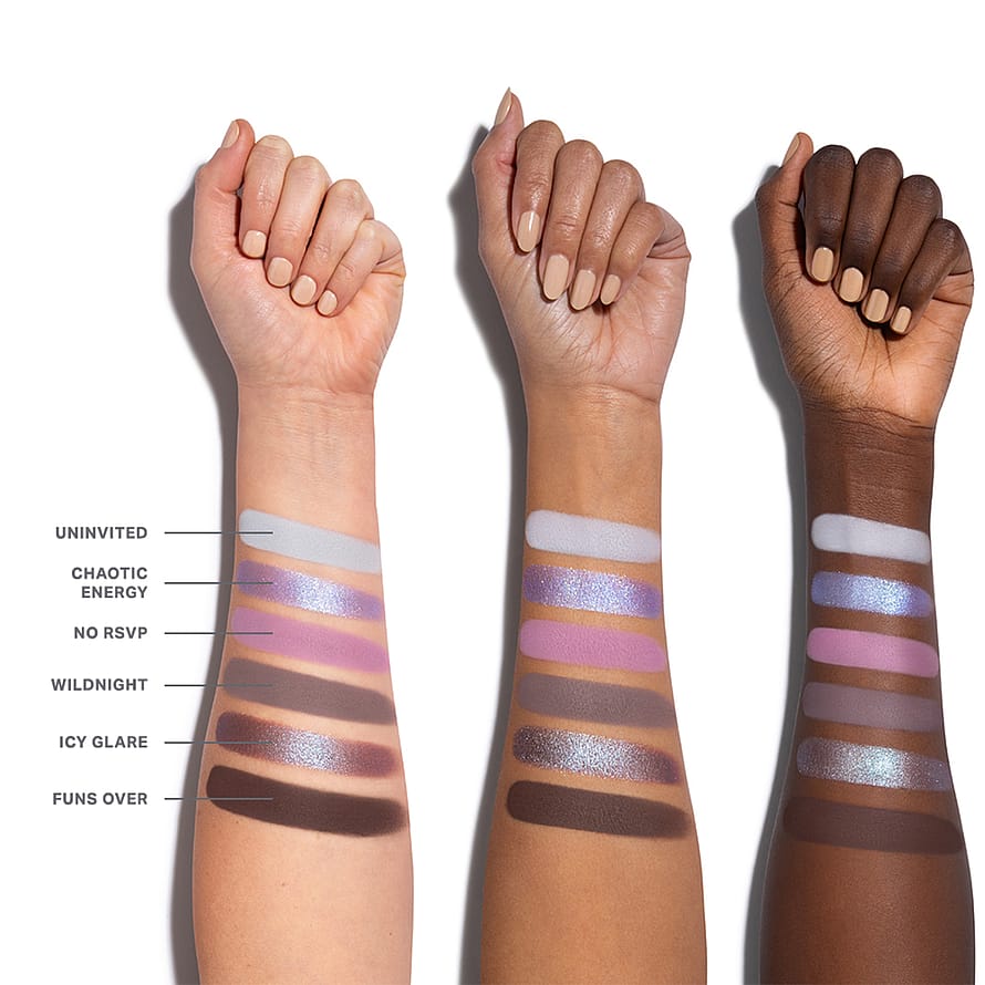 UNINVITED, FUN’S OVER, WILD NIGHT TALC, SYNTHETIC FLUORPHLOGOPITE, MICA, SILICA, MAGNESIUM STEARATE, BORON NITRIDE, DIMETHICONE, HYDROGENATED POLYISOBUTENE, OCTYLDODECL STEAROYL STEARATE, MAGNESIUM MYRISTATE, PHENOXYETHANOL, BIS-DIGLYCERYL POLYACYLADIPATE-2, TOCOPHERYL ACETATE, CAPRYLYL GLYCOL, ETHYLHEXYLGLYCERIN, TOCOPHEROL, KAOLIN, TRIETHOXYCAPRYLYLSILANE +/- MAY CONTAIN/PEUT CONTENIR: TITANIUM DIOXIDE (CI 77891), IRON OXIDES (CI 77491, CI 77492, CI 77499), MANGANESE VIOLET (CI 77742), ULTRAMARINES (CI 77007), YELLOW 5 LAKE (CI 19140), BLUE 1 LAKE (CI 42090). NO RSVP TALC, SYNTHETIC FLUORPHLOGOPITE, MICA, SILICA, MAGNESIUM STEARATE, BORON NITRIDE, DIMETHICONE, HYDROGENATED POLYISOBUTENE, OCTYLDODECL STEAROYL STEARATE, MAGNESIUM MYRISTATE, PHENOXYETHANOL, BIS-DIGLYCERYL POLYACYLADIPATE-2, TOCOPHERYL ACETATE, MALTODEXTRIN, CAPRYLYL GLYCOL, ETHYLHEXYLGLYCERIN, TOCOPHEROL +/- MAY CONTAIN/PEUT CONTENIR: IRON OXIDES (CI 77492), CARMINE (CI 75470), BLUE 1 LAKE (CI 42090). CHAOTIC ENERGY CALCIUM ALUMINUM BOROSILICATE, DIMETHICONE, SYNTHETIC FLUORPHLOGOPITE, MICA, PHENYL TRIMETHICONE, POLYGLYCERYL-2 TRIISOSTEARATE, OCTYLDODECYL STEAROYL STEARATE, CAPRYLIC/CAPRIC TRIGLYCERIDE, SILICA, LAURYL PEG-9 POLYDIMETHYLSILOXYETHYL DIMETHICONE, DIPENTAERYTHRITYL HEXAHYDROXYSTEARATE/HEXASTEARATE/HEXAROSINATE, ISOSTEARYL NEOPENTANOATE, POLYSORBATE 80, TIN OXIDE, DIMETHICONE/VINYL DIMETHICONE CROSSPOLYMER, PHENOXYETHANOL, HDI/TRIMETHYLOL HEXYLLACTONE CROSSPOLYMER, VINYL DIMETHICONE/METHICONE SILSESQUIOXANE CROSSPOLYMER, TALC, TOCOPHERYL ACETATE, XANTHAN GUM, ETHYLHEXYLGLYCERIN, CAPRYLYL GLYCOL, SODIUM ACRYLATE/SODIUM ACRYLOYLDIMETHYL TAURATE COPOLYMER, WATER (AQUA, EAU), ISOHEXADECANE, SORBITAN OLEATE, TOCOPHEROL +/- MAY CONTAIN/PEUT CONTENIR: TITANIUM DIOXIDE (CI 77891), IRON OXIDES (CI 77491, CI 77499), MANGANESE VIOLET (CI 77742), FERRIC FERROCYANIDE (CI 77510). ICY GLARE MICA, CALCIUM ALUMINUM BOROSILICATE, DIMETHICONE, PHENYL TRIMETHICONE, POLYGLYCERYL-2 TRIISOSTEARATE, LAURYL PEG-9 POLYDIMETHYLSILOXYETHYL DIMETHICONE, POLYSORBATE 80, SILICA, DIMETHICONE/VINYL DIMETHICONE CROSSPOLYMER, PHENOXYETHANOL, TIN OXIDE, TOCOPHERYL ACETATE, XANTHAN GUM, ETHYLHEXYLGLYCERIN, SODIUM ACRYLATES/SODIUM ACRYLOYLDIMETHYL TAURATE COPOLYMER, CAPRYLYL GLYCOL, WATER (AQUA, EAU), ISOHEXADECANE, SORBITAN OLEATE, TOCOPHEROL +/- MAY CONTAIN/PEUT CONTENIR: TITANIUM DIOXIDE (CI 77891), IRON OXIDES (CI 77491, CI 77499).