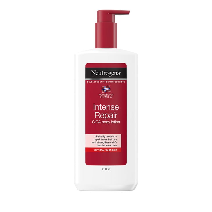 Neutrogena® Norwegian Formula® Intense Repair CICA Body Lotion, 400 ml, med pantenol och allantoin är en kropplsotion som är kliniskt bevisd att fungera som ett återfuktande "bandage" (kosmetisk fuktgivande effekt) för intensiv återfuktning. Den hjälper till att reparera och skydda mycket torr och narig hud redan från första appliceringen. Vid daglig användning blir huden mer motståndskraftig mot torrhet. Tack vare dessa kladdfria och snabbabsorberande formula kan du klä på dig direkt efter applicering.