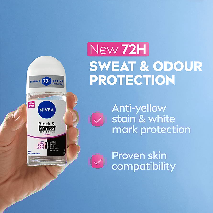 NIVEA Black & White Original Anti-Perspirant är en pålitlig roll-on deo som ger 72 timmars skydd mot svett och lukt. Den unika patenterade anti-stain teknologin förhindrar vita märken på svarta kläder och gula fläckar på vita kläder. Antiperspiranten är skonsam mot huden och ger en bekväm, torr känsla. Black & White Original erbjuder Derma 72h Active-skydd, vilket ger ett starkt och tillförlitligt skydd mot svett och lukt, samtidigt som formulan är snäll mot huden. Produkten innehåller 0% etylalkohol, den är också dermatologiskt testad och passar alla hudtyper. NIVEA är ett av världens mest betrodda hudvårdsmärken med över 140 års erfarenhet.