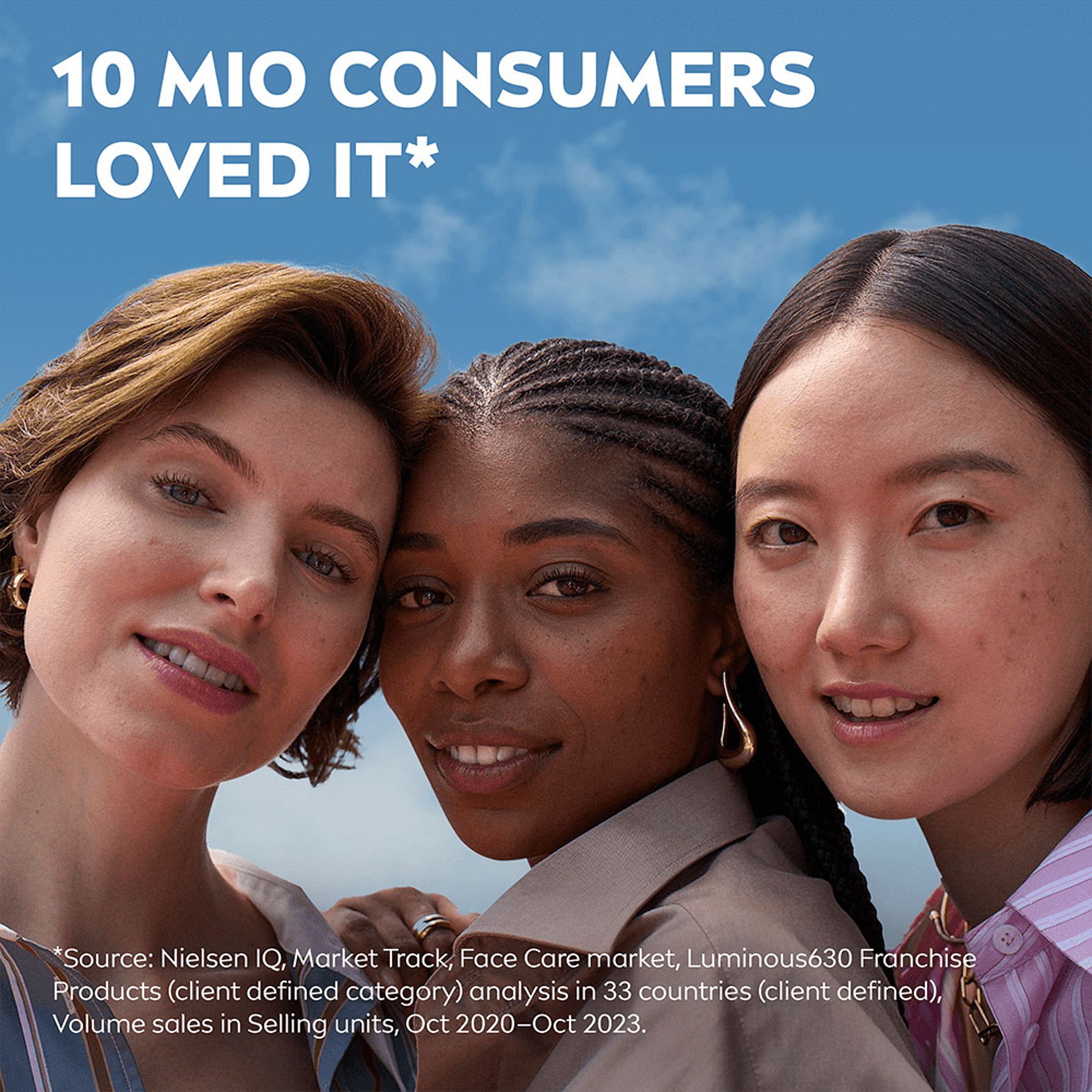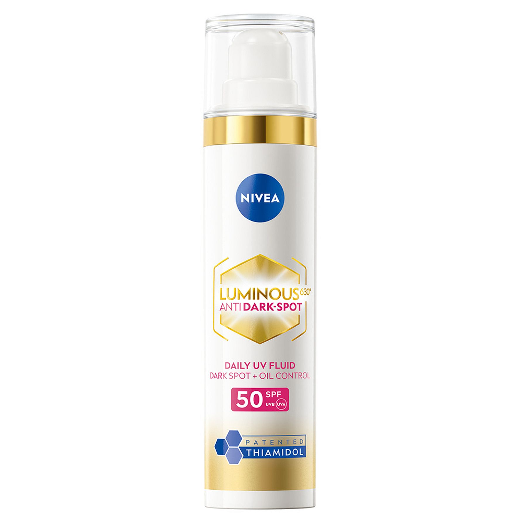 NIVEA Luminous630 Anti Dark-Spot Daily UV Fluid med SPF 50 är en lätt dagkräm som innehåller den patenterade ingrediensen Thiamidol®, som effektivt arbetar med hudens egen process för att minska och motverka uppkomsten av mörka fläckar orsakade av sol, åldrande och hormonella faktorer. Den har en dubbelverkande effekt – den reducerar befintlig pigmentering för att ljusa upp mörka fläckar och minskar deras storlek, samtidigt som den balanserar ny pigmentproduktion för att förhindra att de dyker upp igen vid regelbunden användning. Den uppgraderade och lätta formulan är berikad med Thiamidol®, Hyaluronsyra, Vitamin E och UVA/UVB filter. Huden blir återfuktad och slät med en mattgörande effekt. Denna day fluid är skonsam mot huden, dermatologiskt testad och passar alla hudtyper. För en jämnare och mer strålande hud.