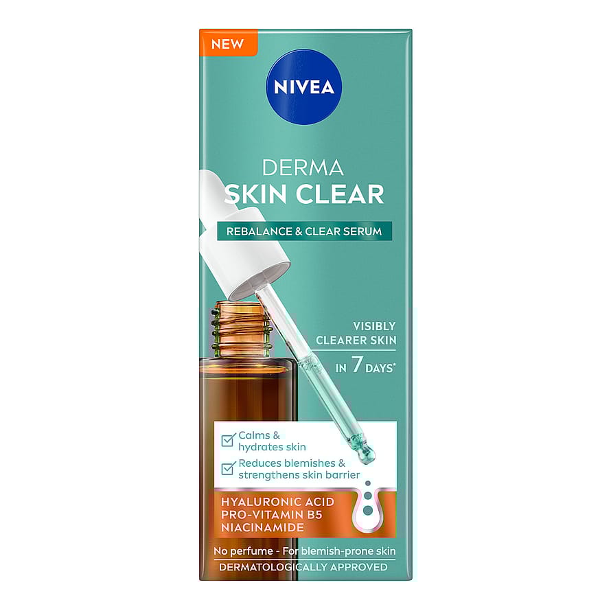 Vill du återfå kontrollen över din hud? NIVEA Derma Skin Clear Rebalance & Clear Serum är särskilt framtaget för stressad och blemmig hud. Ett lätt serum som är berikat med hyaluronsyra, Pro-Vitamin B5 och niacinamid lugnar, återfuktar huden och stärker hudbarriären för en frisk hud med förbättrad motståndskraft. Dessutom reducerar den blemmor för synligt förbättrad hud och förminskade porer på 7 dagar. Hudkompatibiliteten är dermatologiskt godkänd och effekten på oren, blemmande hud är kliniskt testad. NIVEA Derma Skin Clear Rebalance & Clear Serum används i din Derma Skin Clear morgonrutin, efter Derma Skin Clear Wash Gel och Derma Skin Clear Toner.