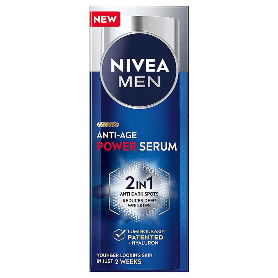 NIVEA MEN Anti-Age 2in1 Power Serum är ett återfuktande serum för män. Vår avancerade formula med patenterade LUMINOUS630 och Hyaluron hjälper till att motverka tecken på hudåldrande genom att synligt reducera djupa rynkor och pigmentfläckar. 2i1-formulan verkar både som anti-age och anti-spot, vilket gör den perfekt för män som vill ha ett ungdomligt och självsäkert utseende. Den lätta och snabbabsorberande formulan ger både näring och fukt till huden, för en fräsch hudkänsla. Detta serum ger 24h återfuktning, reducerar storleken och intensiteten av pigmentfläckar och huden ser ungdomligare ut på bara 2 veckor! Passar för daglig användning och för alla hudtyper.