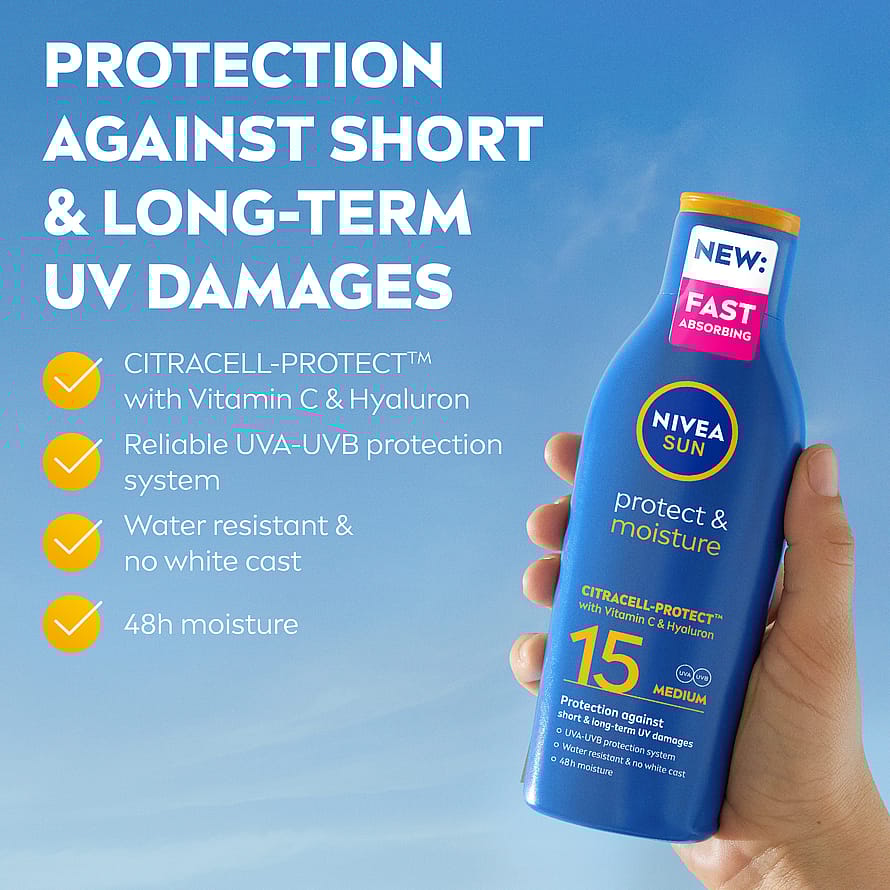 NIVEA SUN Protect & Moisture Sun Lotion SPF 15 är en solkräm med ett medelhögt skydd som ger skydd mot lång- och kortsiktiga UVA- och UVB-skador. Den nya formulan med CitraCell-ProtectTM med C-vitamin och hyaluron verkar bortom UV-filter genom att hjälpa huden att bilda en andra skyddslinje och minskar effektivt hudens oxidativa stress på cellnivå (in vitro). Dessutom återfuktar den nya formulan huden i 48 timmar och ger en frisk och mjuk hudkänsla. Vattenresistent och lämnar ingen vit hinna på huden. Passar alla hudtyper och dermatologiskt testat. Denna Ocean Respect-formula är fri från UV-filter så som Octinoxate, Oxybenzone och Octocrylene.